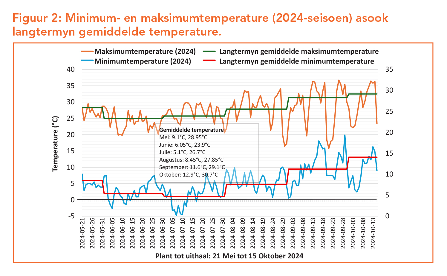 Minimum- en maksimumtemperature word in Figuur 2 uiteengesit. Groot wisseling is sigbaar in maksimum- sowel as minimumtemperature gedurende die laaste drie maande van die seisoen. Alhoewel geen ryp deur die nabygeleë weerstasie aangeteken is nie, is ryp wel oor die proefperseel aangeteken. Die kultivar, Sound, het noemenswaardig uitgestaan ná hierdie ryptoestande, met die loof wat uiteindelik baie weliger en hoër gestaan het as die ander kultivars s’n. Dit is ‘n aanduiding dat Sound goeie ryptoleransie in hierdie gebied toon.