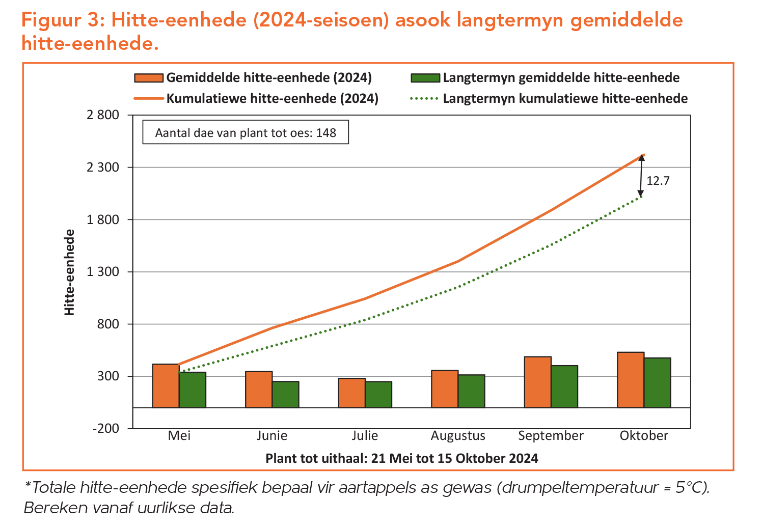 Die versameling van hitte-eenhede gedurende ’n groeitydperk is ’n belangrike faktor in die ontwikkeling van ’n aartappelplant. Die tendens van hitte-eenhede wat vir hierdie seisoen se Dendron-kultivarproef beskikbaar is, blyk hoër te wees as die langtermyndatatendens van hitte-eenhede (Figuur 3).