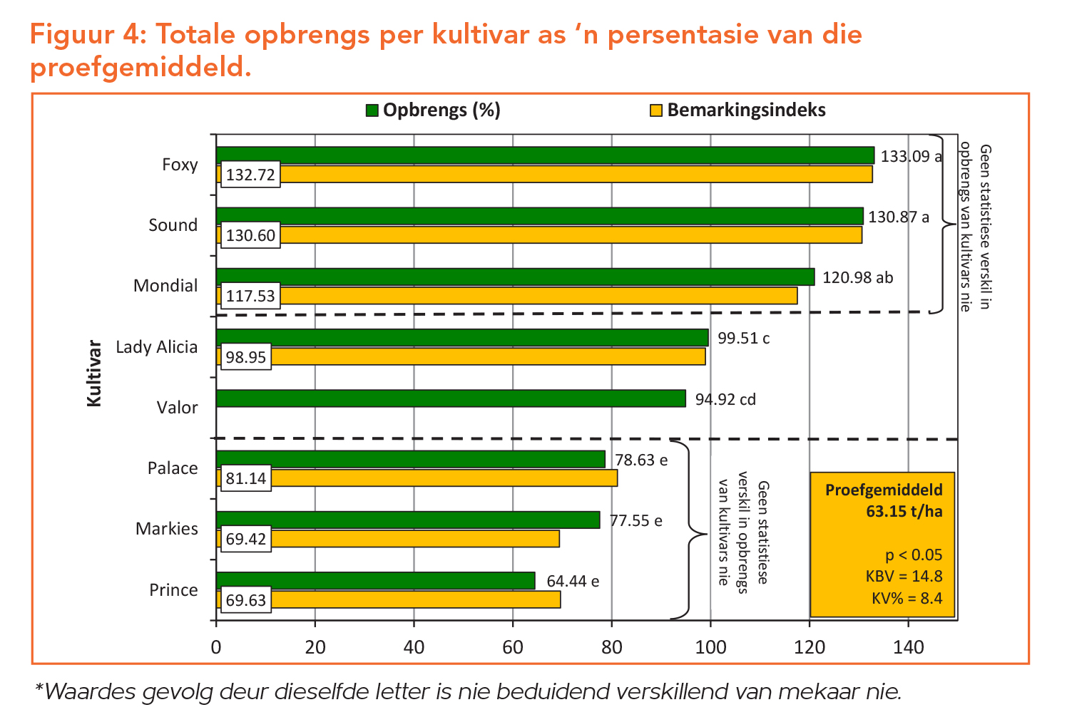 Die opbrengs van elk van die kultivars word deur die proefgemiddeld gedeel, met die proefgemiddeld van al die kultivars wat as 100% geneem word. Hierdeur word ’n opbrengsindeks bepaal en word elke kultivar se prestasie in terme van opbrengs, as ’n persentasie van die proefgemiddeld gelees.