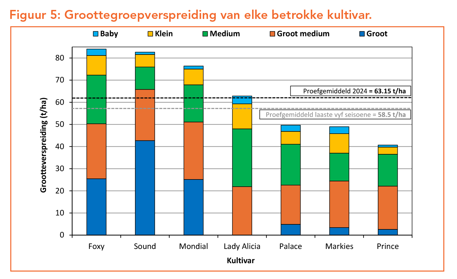 Die gemiddelde opbrengs van die proef vir die 2024-seisoen is 63.15 t/ha, wat hoër is as die vorige vier seisoene se gemiddeld van 57.38 t/ha. Foxy, Sound en Mondial het die beste opbrengs gelewer met geen statistiese verskil in opbrengs nie. Dieselfde drie variëteite het ook die beste bemarkingsindekse behaal.