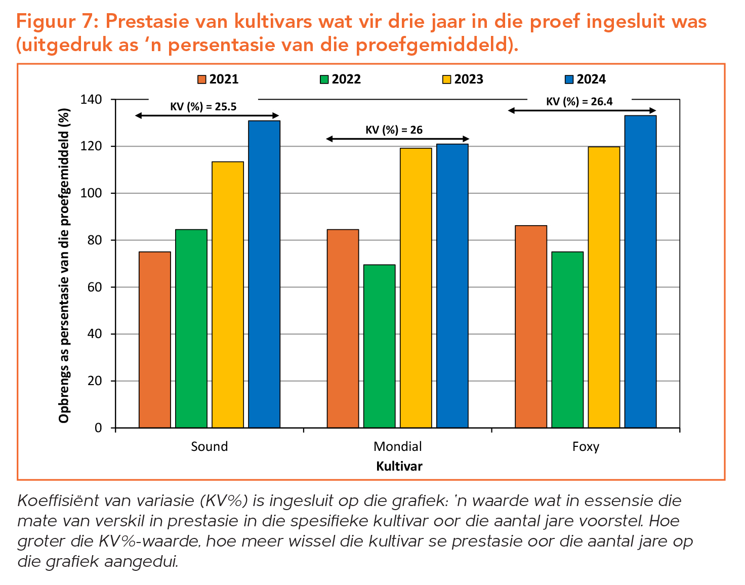Soos die aard van seisoene is, wissel die prestasie van kultivars van seisoen tot seisoen, bloot omdat klimaat van een seisoen na ’n volgende nooit eenders is nie. Derhalwe is dit belangrik om konsekwente kultivarprestasie oor ’n aantal seisoene in ag te neem. Die afgelope drie seisoene se variasie in deelnemende kultivars word in Figuur 7 aangedui.
