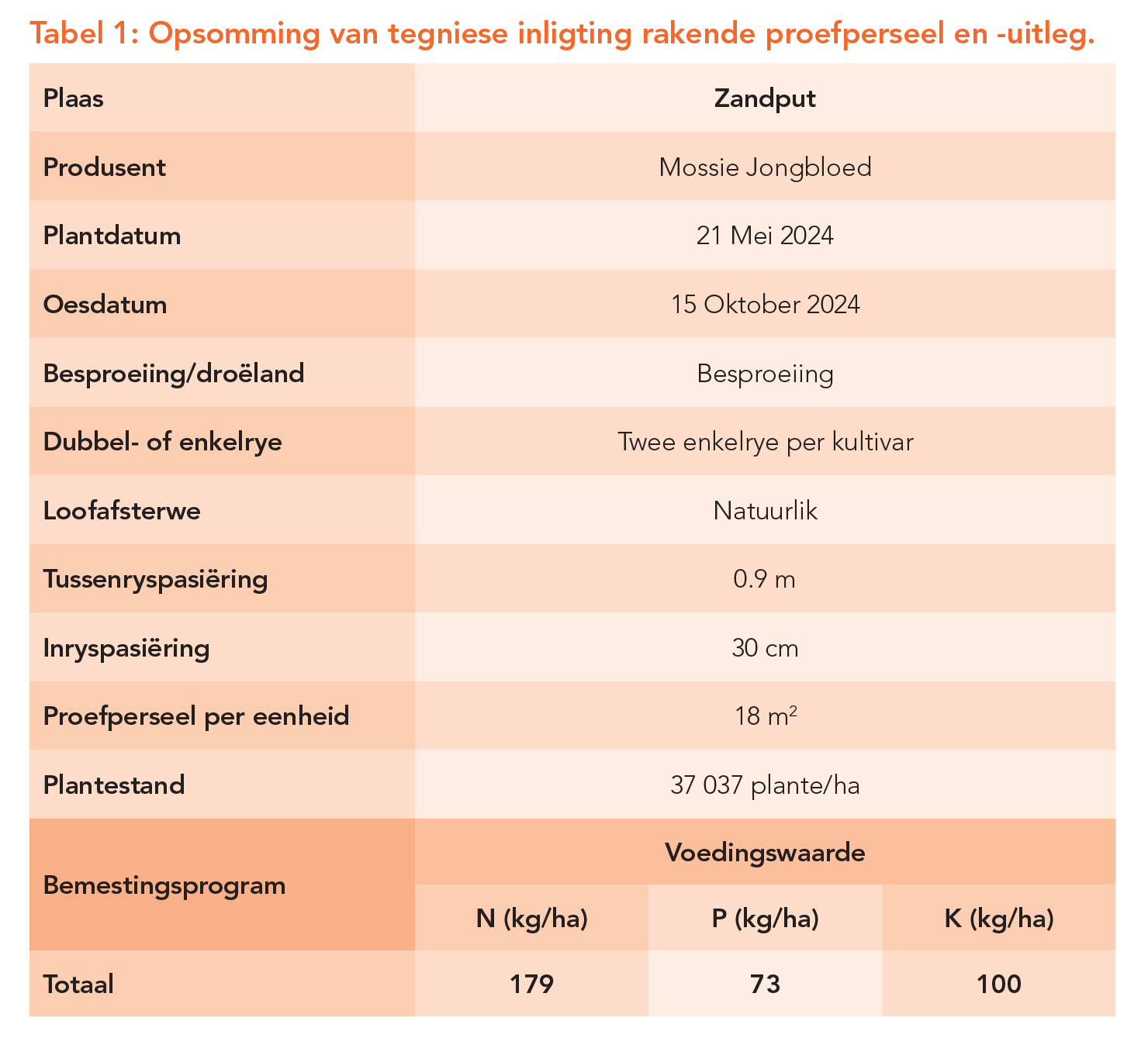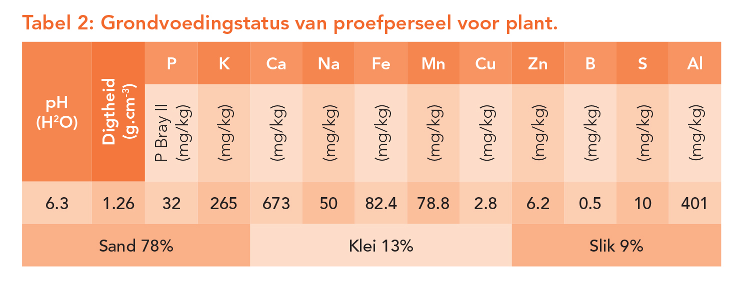 Die Dendron-kultivarproef is in ’n ewekansige blokontwerp met drie herhalings per kultivar uitgelê. Tabel 1 bevat bykomende tegniese inligting oor die proef. Grondmonsters is voor plant geneem om die proefperseel se grondvoedingstatus te bepaal (Tabel 2).