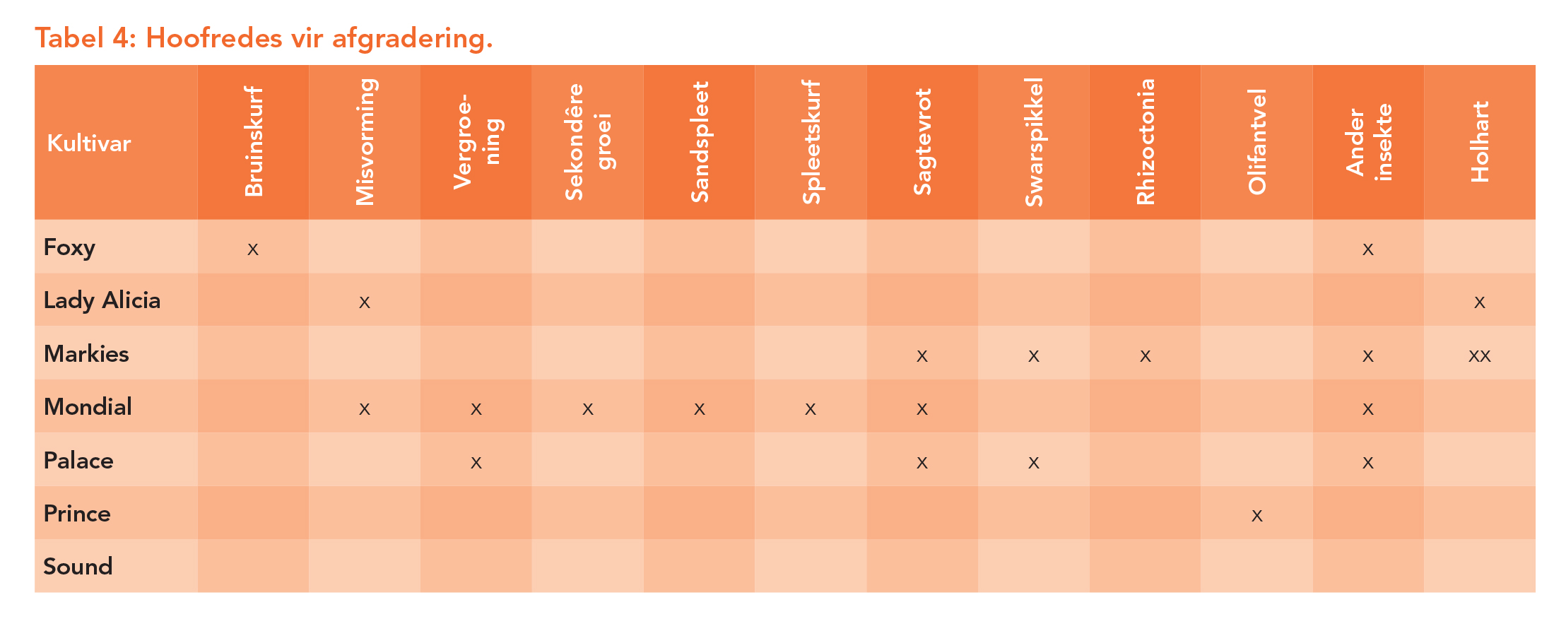 Die hoofredes vir afgradering word in Tabel 4 aangedui. Insekskade in die vorm van snywurmgate asook sagtevrot het die grootste invloed op die afgradering van aartappels in hierdie proef gehad.