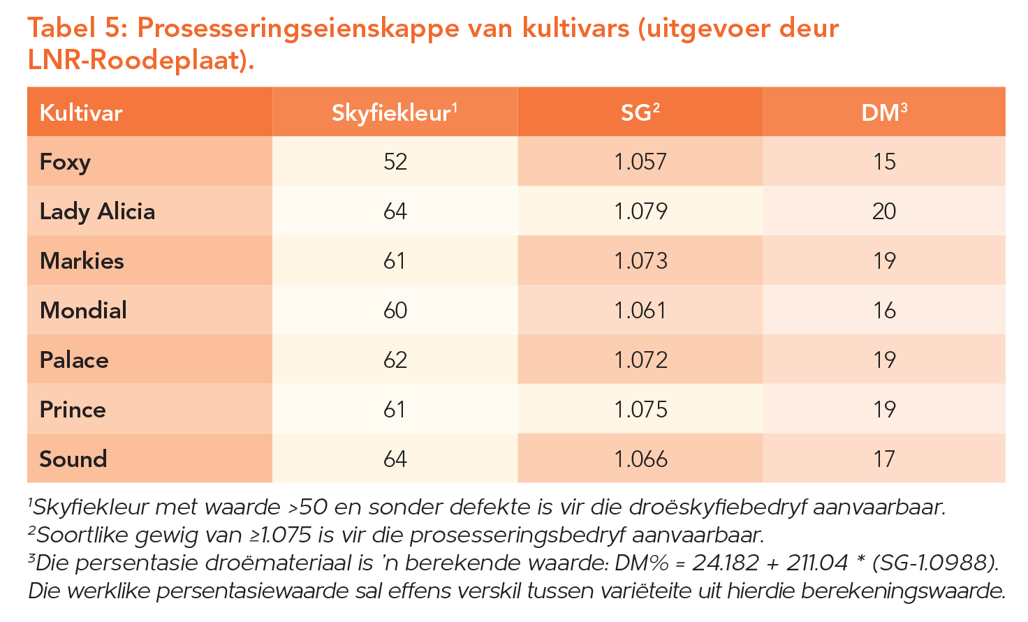 Laastens, wanneer gekyk word na interne gehalte van aartappels, kan prosesseringseienskappe ook geëvalueer word. Om aan prosesseringsvereistes te voldoen, moet kultivars aan ’n skyfiekleurnorm van >50 en ’n soortlike gewig (SG) van ≥1.075 voldoen (Tabel 5).