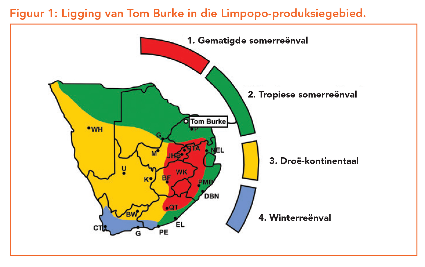 Tom Burke val in Suid-Afrika se tropiese somerreënvalgebied (Figuur 1) en ontvang die afgelope 16 jaar ’n gemiddelde jaarlikse reënval van 372 mm, aldus die nabygeleë Landbounavorsingsraad (LNR)-weerstasie. Winters in hierdie streek is koel en kort, terwyl die somers baie warm en lank is. Gedurende die wintermaande van Mei tot Julie, ervaar die streek langtermyntemperature van gemiddeld 6°C minimum en 27°C maksimum, met baie min dae waar die kwik onder 0°C daal. Derhalwe is twee produksieseisoene hier moontlik: ’n Vroeë aanplanting gedurende Januarie tot Maart met die hoofaanplanting vanaf April tot Julie. Danksy hierdie twee aanplantings, is die streek se bydrae tot die Suid-Afrikaanse aartappelbedryf een van die grootste.