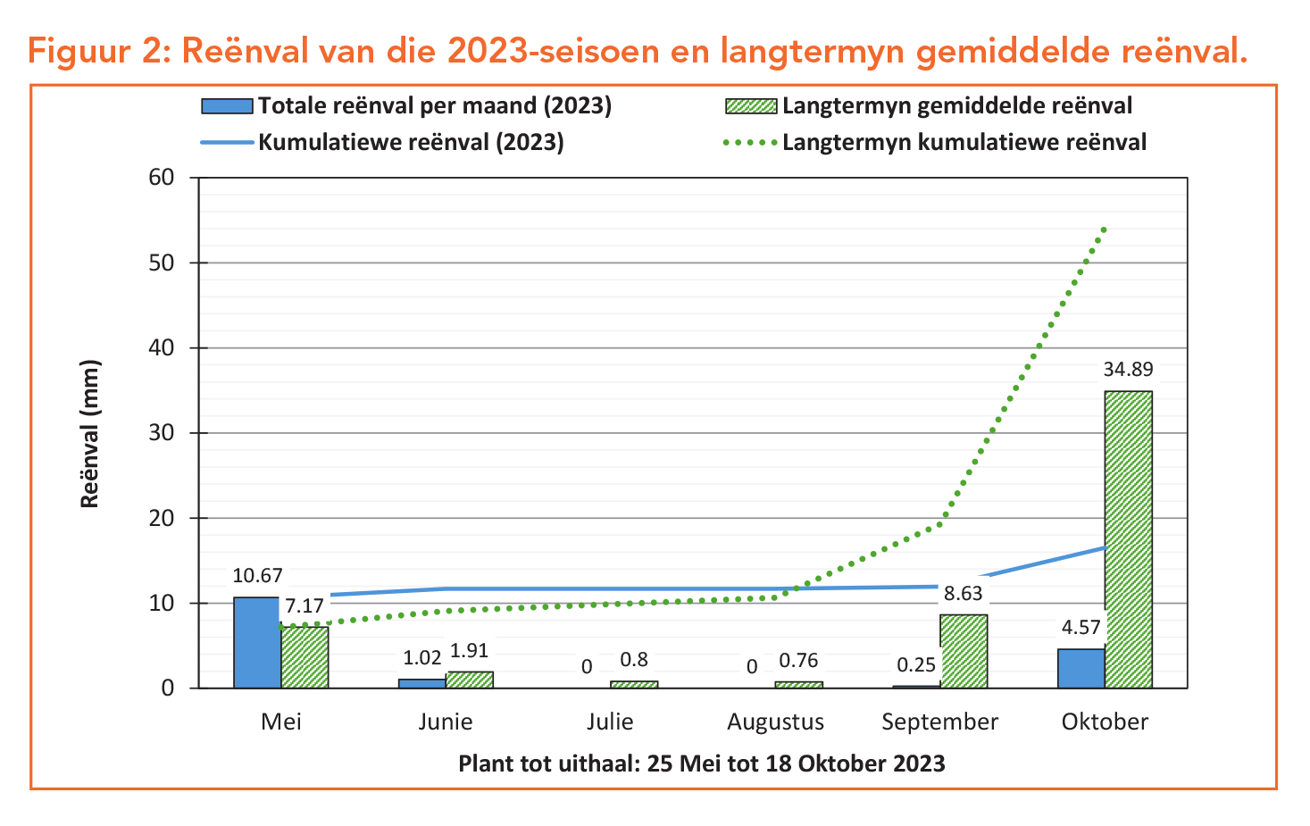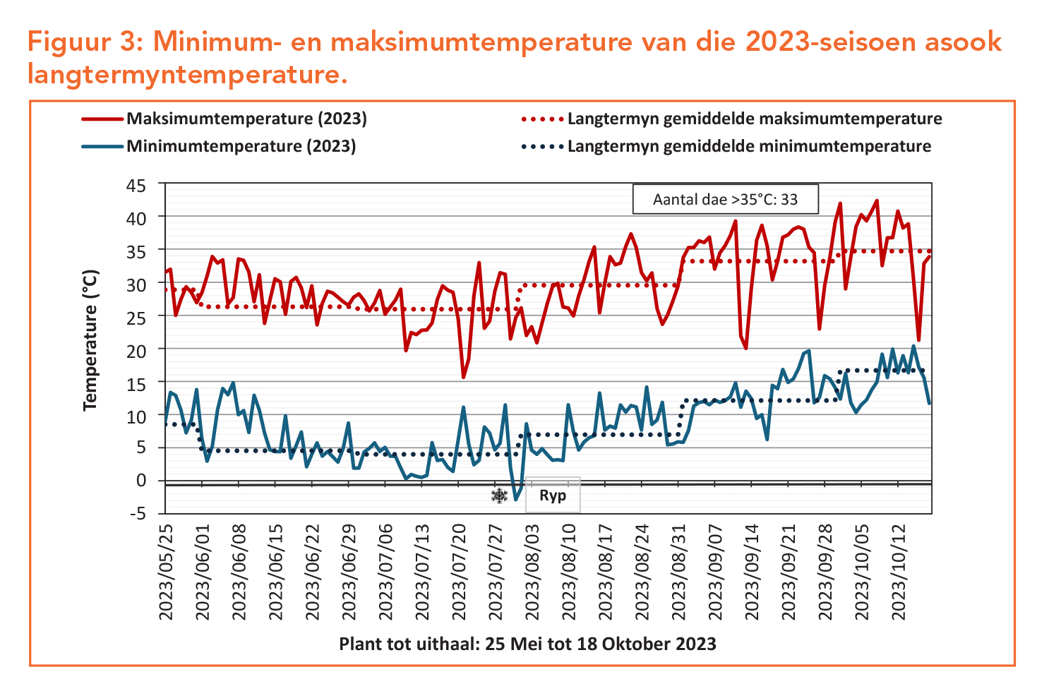 Reënvaldata is aangeteken in Figuur 2. September en Oktober kry tradisioneel meer reënval as wat gedurende hierdie seisoen aangeteken is. Omdat Tom Burke somerreënval kry, is voldoende besproeiingskedulering belangrik, veral gedurende kritieke groeitye wanneer dit warm is. Minimum- en maksimumtemperature word in Figuur 3 uiteengesit. Groot temperatuurwisseling is gedurende die seisoen sigbaar. In totaal is daar vir 33 dae temperature bo 35°C aangeteken en vir vyf dae selfs bo 40°C. Een voorval van ryp is aangeteken vir einde Julie, met Tyson en Sound wat die meeste rypskade opgedoen het.