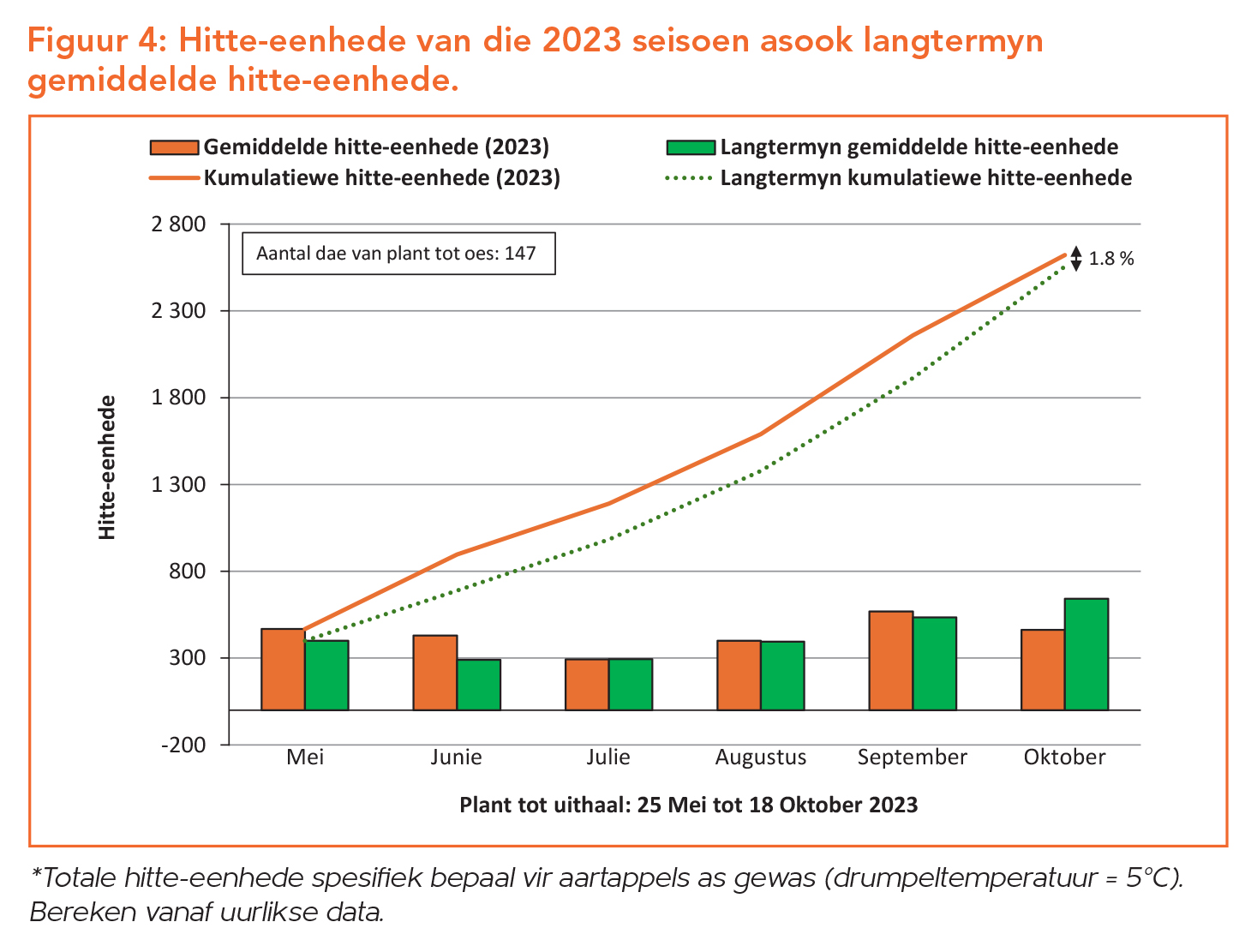 Die versameling van hitte-eenhede gedurende ’n groeitydperk is ’n belangrike faktor in die ontwikkeling van ’n aartappelplant. Die tendens van hitte-eenhede beskikbaar vir die kultivarproef van hierdie seisoen by Tom Burke, blyk hoër as die langtermyndatatendens van hitte-eenhede te wees, veral in die eerste maand na plant. Vanaf 25 Mei tot 30 Junie was dit gemiddeld 2°C warmer as die langtermyn gemiddelde temperature en is meer hitte-eenhede in hierdie tydperk geakkumuleer (Figuur 4).