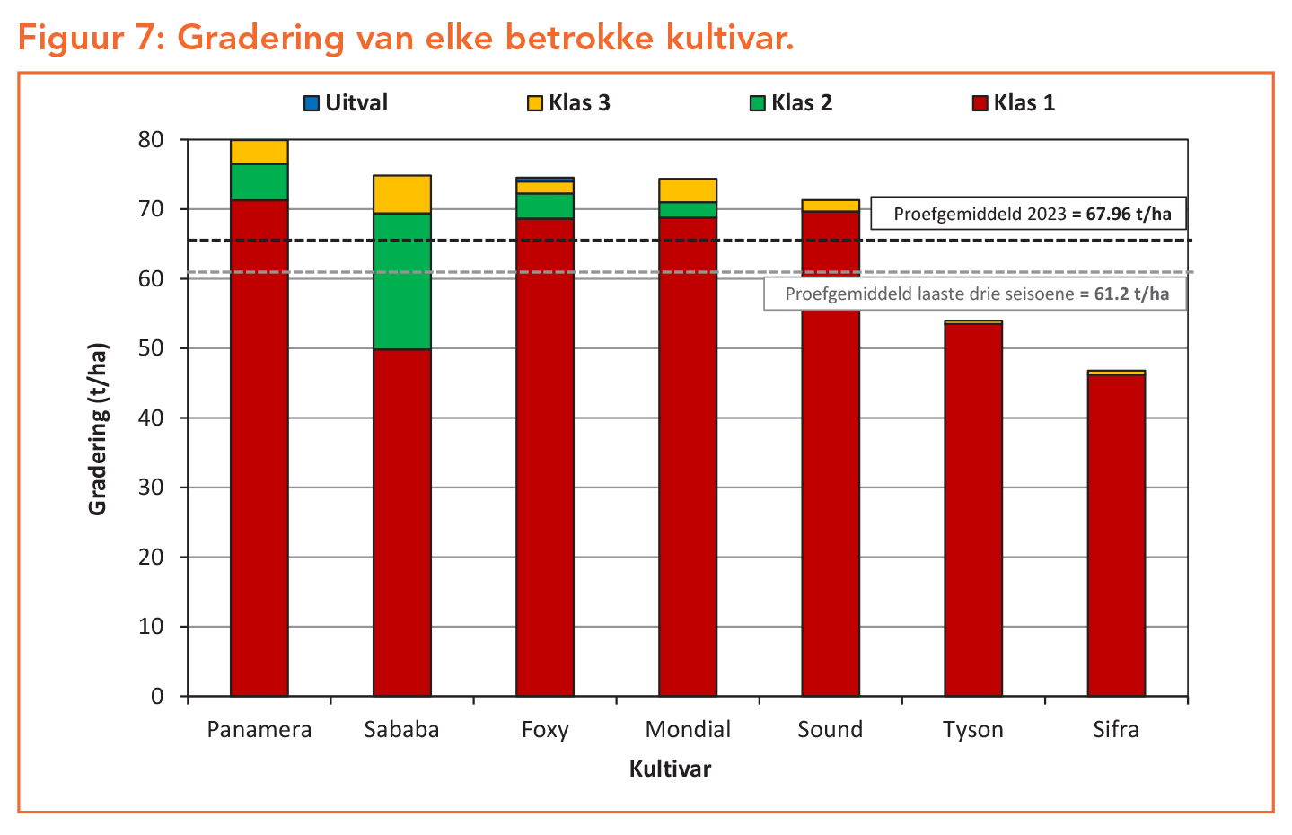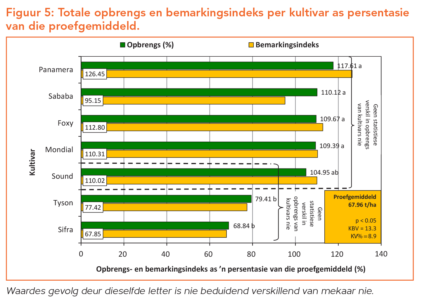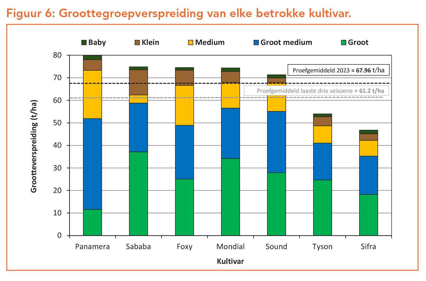 Dit is hoër as die vorige drie seisoene se gemiddeld van 61.2 t/ha. Panamera, Sababa, Foxy, Mondial en Sound het almal die beste opbrengs gelewer met geen statistiese verskil in opbrengs nie. Panamera het ook die beste bemarkingsindekse behaal. ’n Goeie bemarkingsindeks word toegeskryf aan ’n hoër opbrengs van groot aartappels en/of ’n goeie persentasie goeie-gehalte aartappels. Groottegroepverspreiding en gradering is onontbeerlike evaluasies wanneer gekyk word na ’n aartappelkultivar se bemarkbaarheid (Figure 6 en 7).