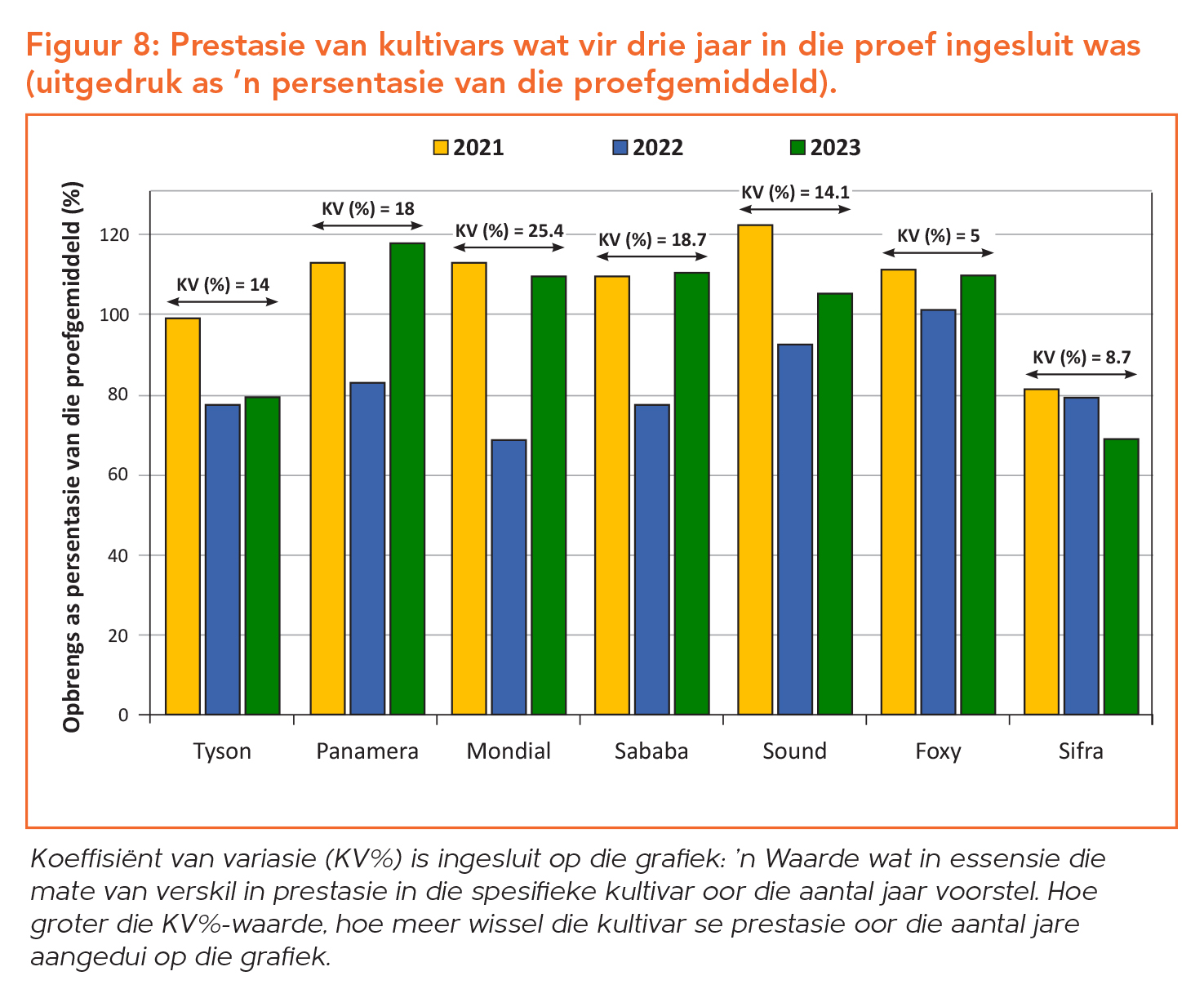 Die prestasie van nuwe kultivars kan nie net op die resultate van een bepaalde seisoen geskoei word nie, omdat klimaat van een jaar na ’n volgende kan wissel. Juis daarom word die kultivars verkieslik oor ’n aantal seisoene getoets.