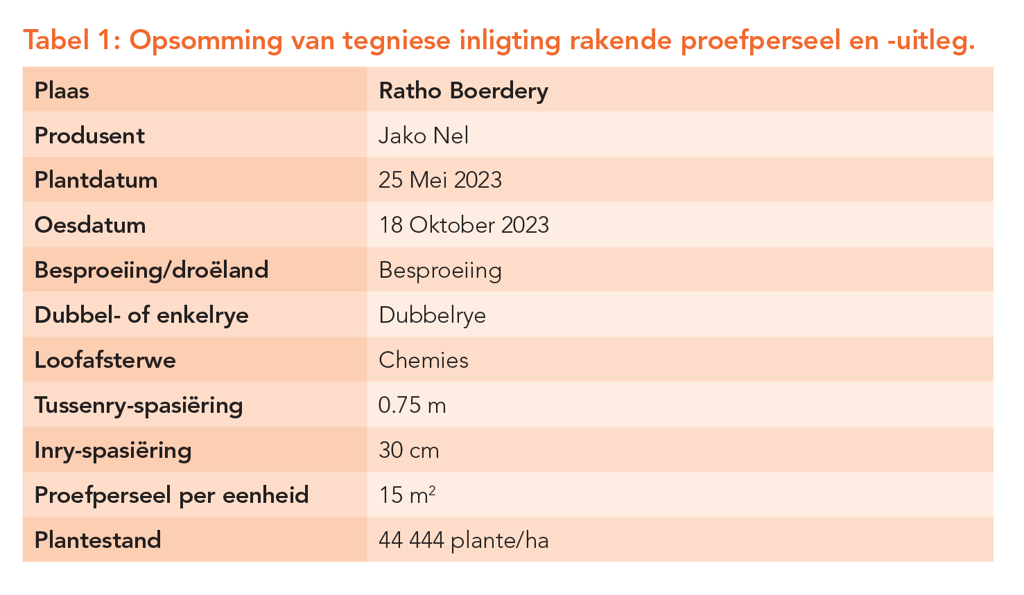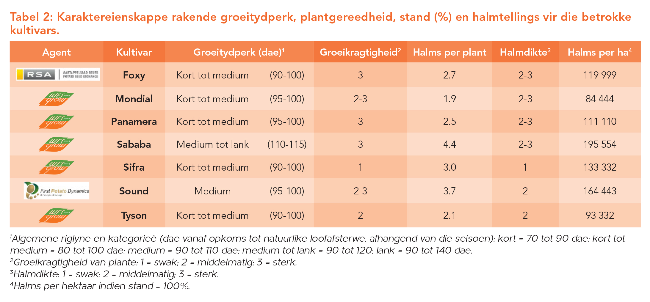 Die kultivarproef by Tom Burke is in ’n ewekansige blokontwerp met vier herhalings per kultivar uitgelê. In Tabel 1 word bykomende tegniese inligting rakende die proef gegee. Ingesluit in die kultivarproef is kultivars met kort en lang groeitydperke; derhalwe kan groeitydperke die uiteindelike opbrengs van sekere kultivars beïnvloed. Die lengte van groeitydperke is onderhewig aan die aard van die seisoen, maar word gesien as die hoeveelheid tyd wat verloop vanaf opkoms tot natuurlike loofafsterwe. Tabel 2 sit uiteen hoe hierdie groeitydperke van kultivar tot kultivar verskil. Die groeikragtigheid en halmdikte van jong plante is deur die produsent waargeneem en aangeteken in die plek van die gebruiklike plantgereedheid en standtellings, en word ook in Tabel 2 aangedui.