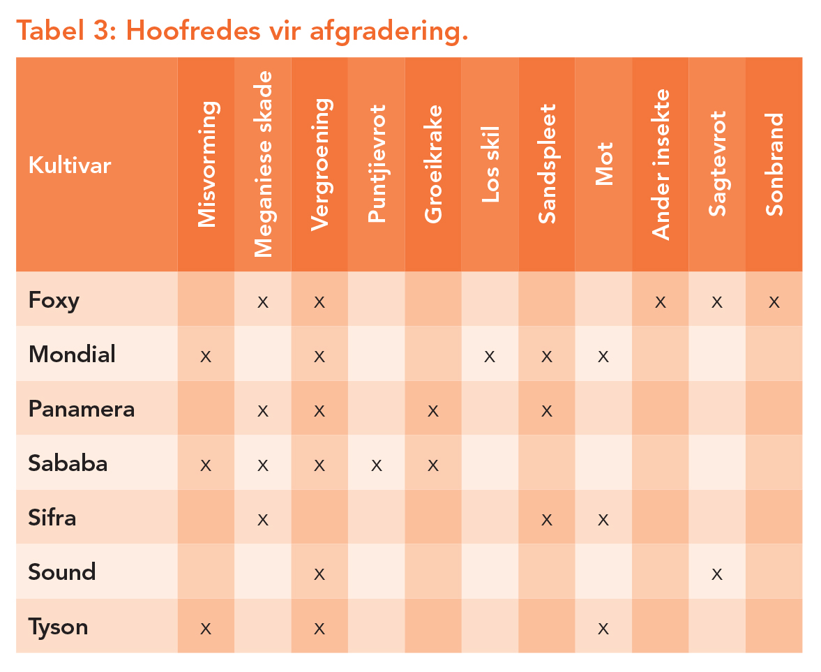 Die hoofredes vir afgradering word in Tabel 3 aangedui. Meganiese skade en vergroening het die grootste invloed gehad op die gehalte van aartappels in hierdie proef. Soos die aard van seisoene is, wissel die prestasie van kultivars van seisoen tot seisoen, bloot omdat klimaat van een seisoen na ’n volgende nooit eenders is nie.