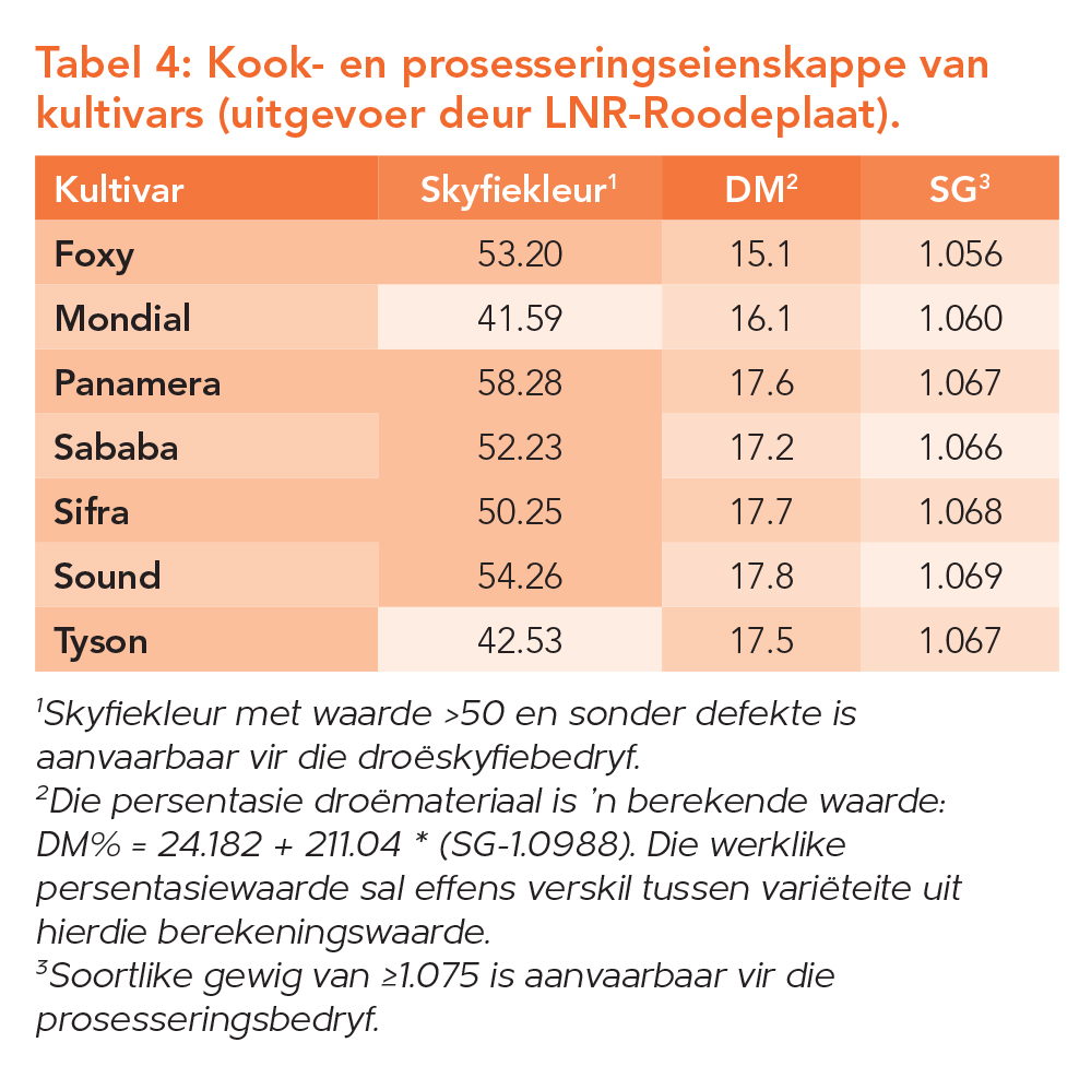 Derhalwe is dit belangrik om konsekwente kultivarprestasie oor ’n aantal seisoene in ag te neem. Die afgelope drie seisoene se variasie onder deelnemende kultivars word in Figuur 8 aangedui, met Foxy en Sifra wat by uitstek die minste variasie toon. Laastens, wanneer gekyk word na die interne gehalte van aartappels, kan prosesseringseienskappe ook geëvalueer word. Om te voldoen aan prosesseringsvereistes moet kultivars aan ’n skyfiekleurnorm van >50 en ’n soortlike gewig (SG) van ≥1.075 voldoen (Tabel 4). Byna al die kultivars het aan die vereiste skyfiekleur voldoen, terwyl geen aan die SG-vereiste voldoen het nie. Geen interne defekte soos bruinvlek of holhart is waargeneem nie. – Enrike Verster, Aartappels SA