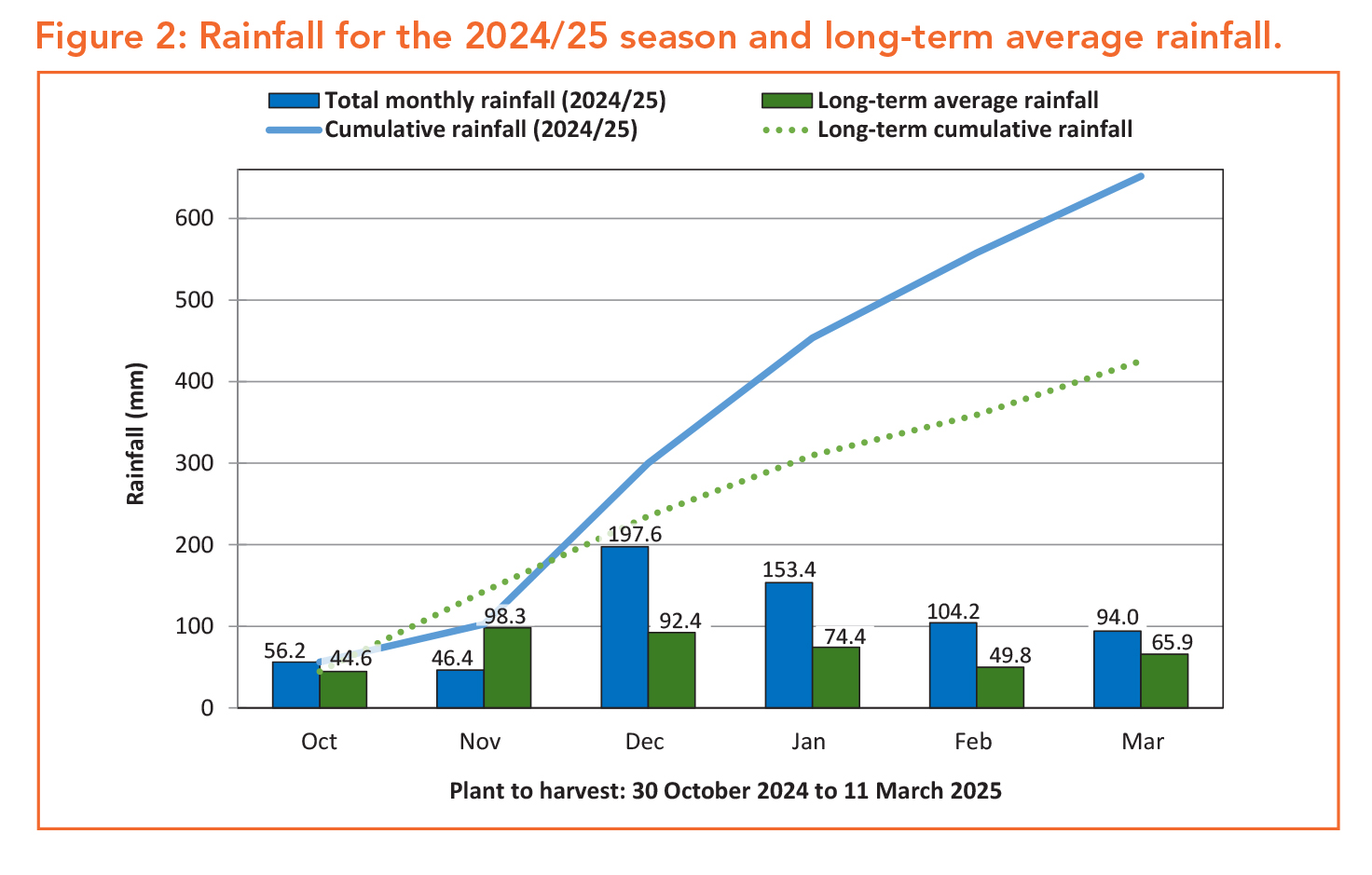 Applicable daily weather data for the season is obtained from a weather station located on the farm where the trial was conducted. The long-term data, however, comprises data from the past six years generated by the nearest ARC weather station, located 21 km south of the trial.
