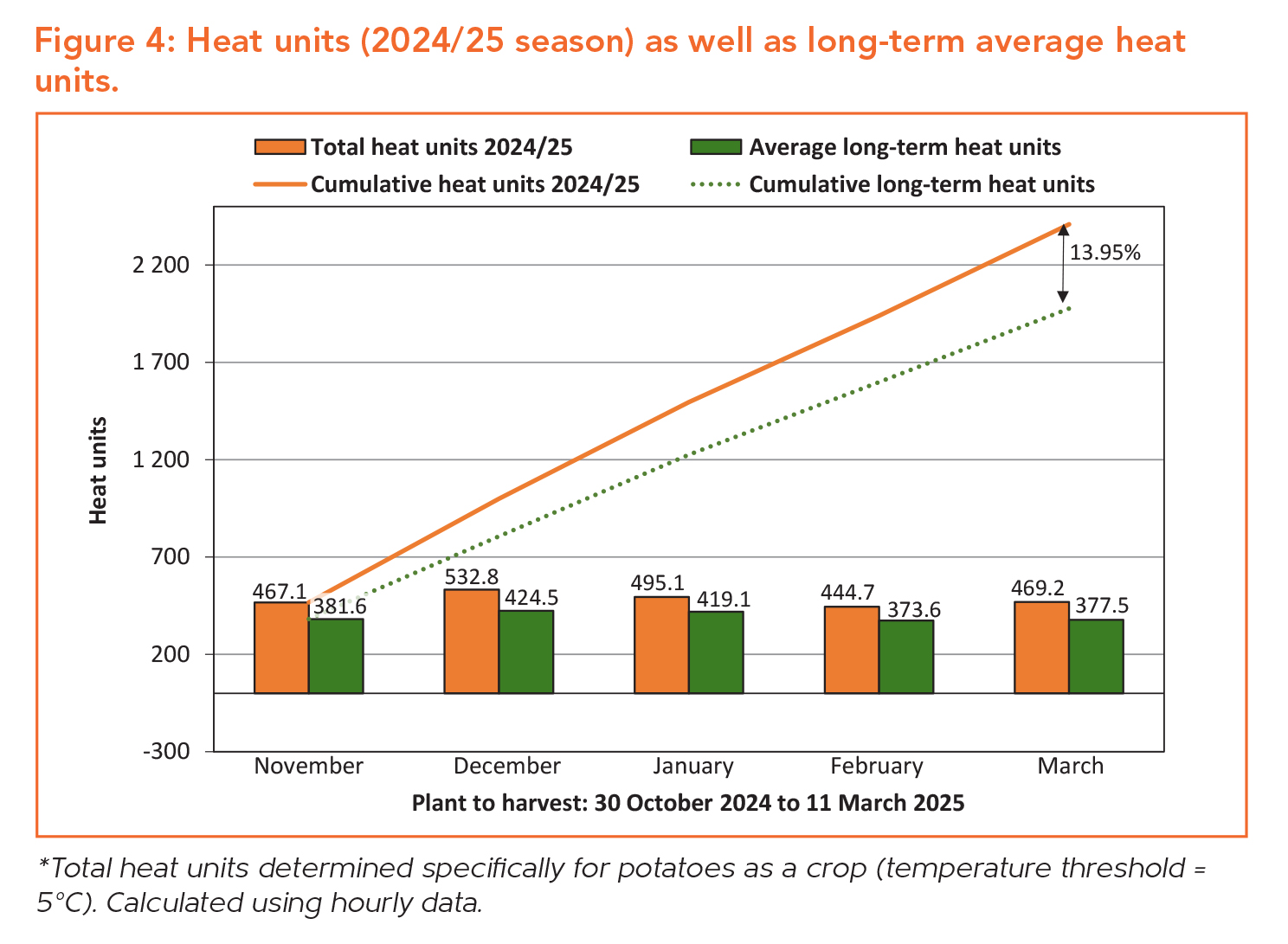 The collection of heat units during a growing period is an important factor in the development of a potato plant. The trend of heat units available for this season’s Davel cultivar trial appears to be higher than the long-term data trend of heat units (Figure 4). The available temperature data also indicates that it was an exceptionally warm season.
