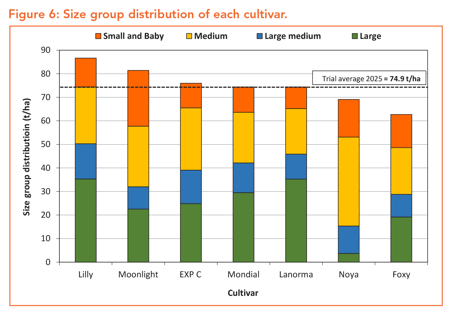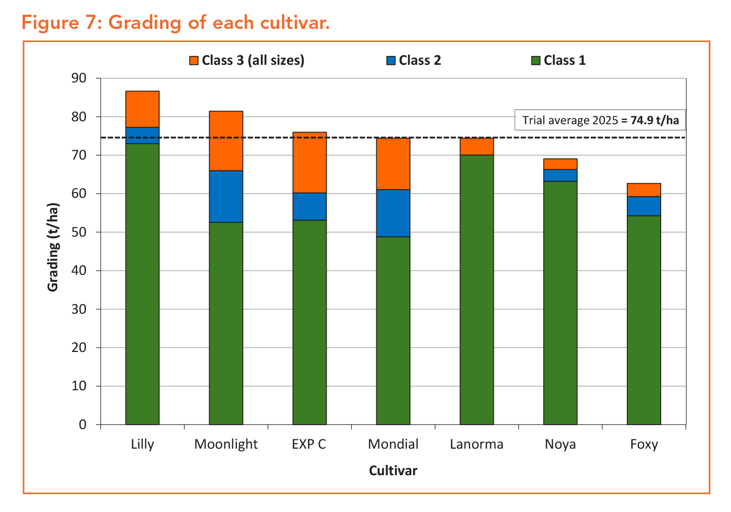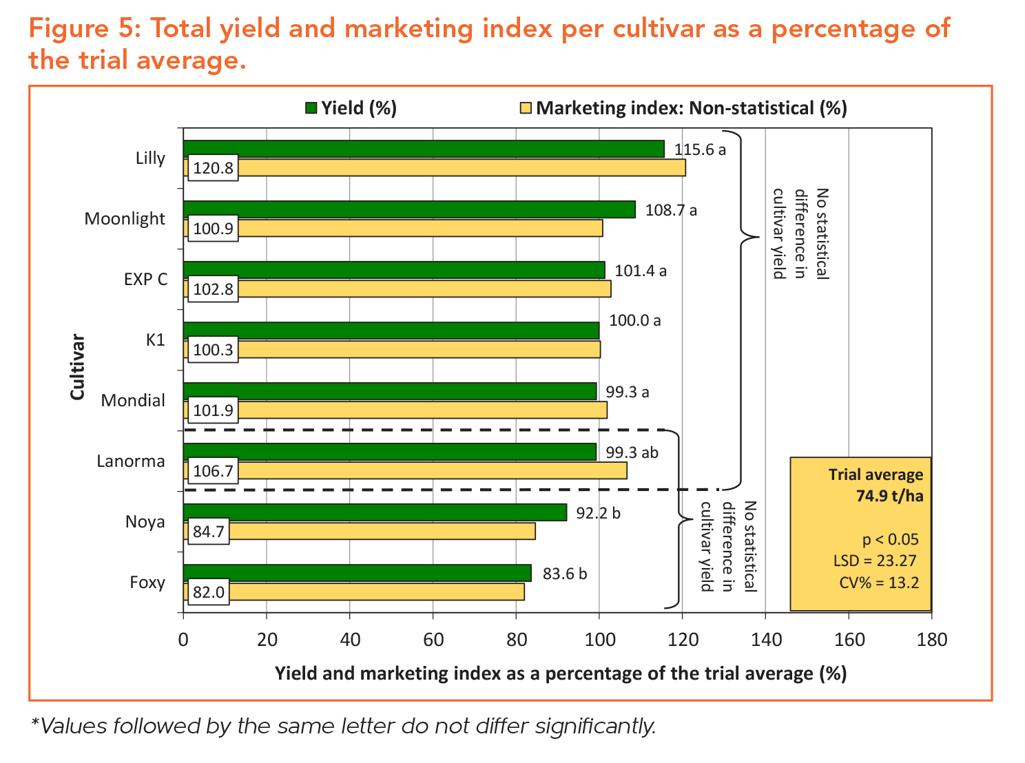 The evaluation of new cultivars, as in the case of the Davel cultivar trial, provides results relating to yield and marketing index. The marketing index of the cultivars involved are calculated by classing and sorting each cultivar based on quality and size groups (for example Class 1 large or Class 2 large-medium).