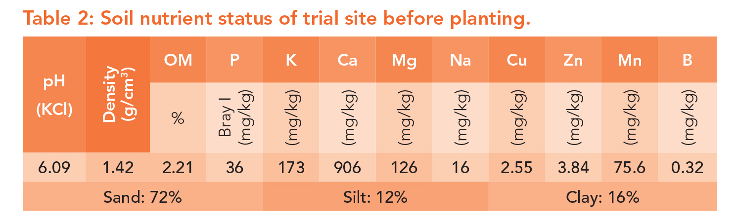 The cultivar trial was laid out in a randomised block design with three replications per cultivar. Table 1 contains relevant technical information regarding the trial. Soil samples were taken prior to planting to determine the soil’s nutritional profile at the trial site (Table 2).