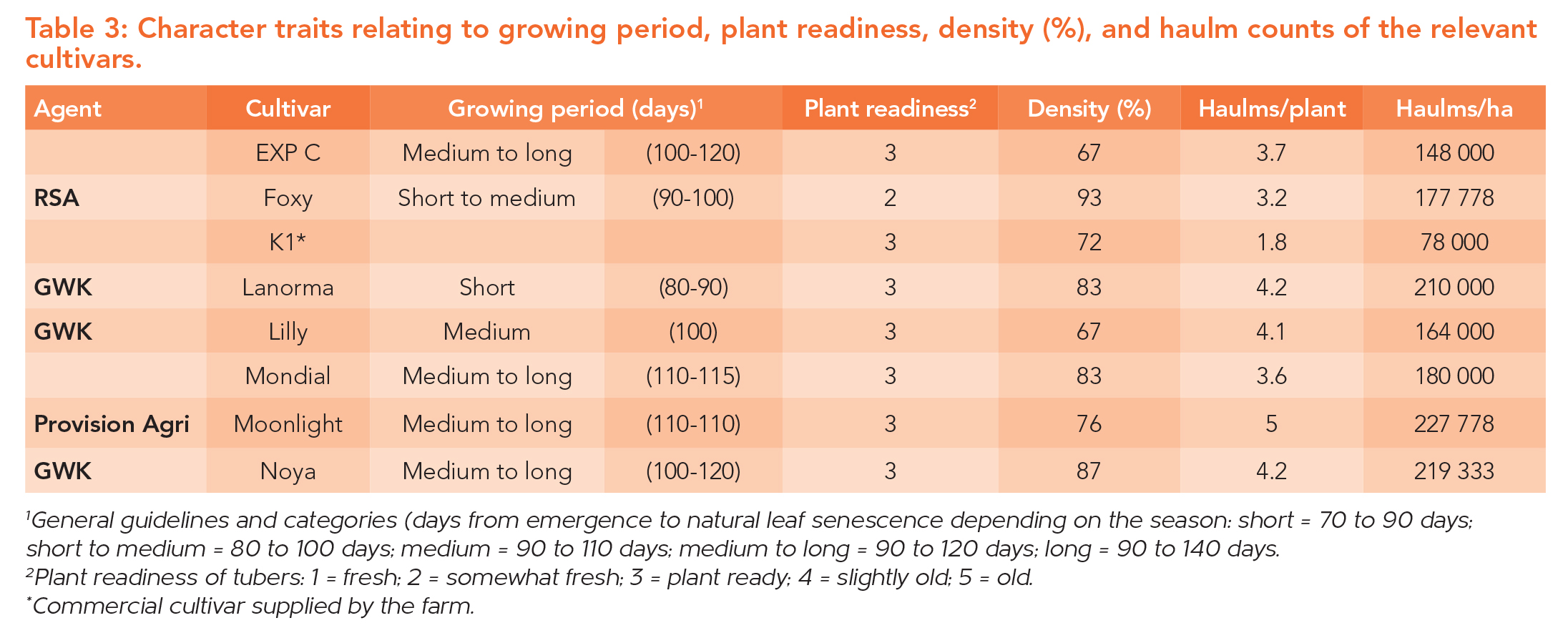 Table 3 contains the plant readiness of tubers at the time of planting, as well as the haulm count later in the growing season.