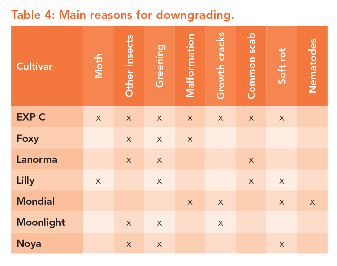The main reasons for downgrading are indicated in Table 4. Greening and insect damage were the major reasons for downgrading potatoes to Class 2 and 3.