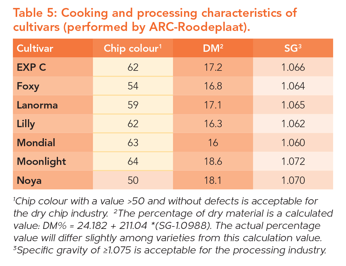 Lastly, processing characteristics can also be evaluated by studying the internal quality of potatoes. To adhere to processing requirements, cultivars must meet a specific gravity (SG) of ≥1.075 (Table 5). No cultivar met the desired SG requirement, but almost all had the correct chip colour. – Enrike Verster, Potatoes SA