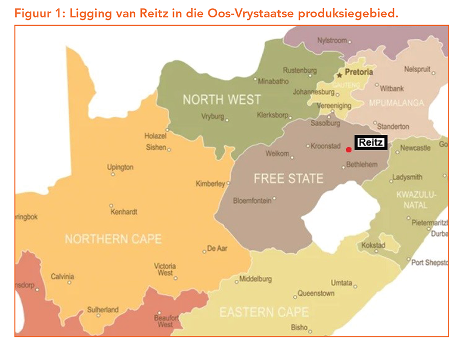 Reitz val in Suid-Afrika se gematigde somerreënvalgebied (Figuur 1) en ervaar die afgelope 20 jaar ’n gemiddelde jaarlikse reënval van sowat 509 mm. Hierdie streek ervaar warm somers en baie koue winters, met ryp wat vanaf middel Mei tot vroeg September kan voorkom.