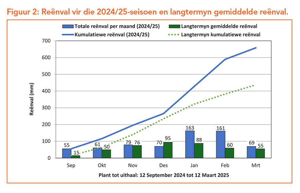 Die reënvaltendens vir die 2024/25-seisoen (Figuur 2) toon heelwat meer reën as die kumulatiewe langtermyn gemiddeld. Uitermatige bogemiddelde reënval is veral tydens die laaste maande voor oes aangeteken, wat groter persentasie weggooi-aartappels op grond van gehalte meegebring het (Figuur 7).