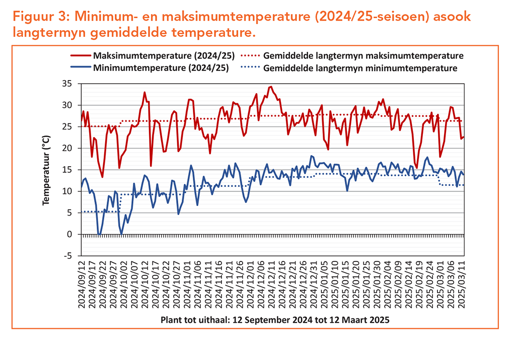 Minimum- en maksimumtemperature word in Figuur 3 uiteengesit. Die betrokke seisoen het besonder groot wisselinge in maksimumtemperature ervaar, veral tydens die eerste drie maande van die groeitydperk.
