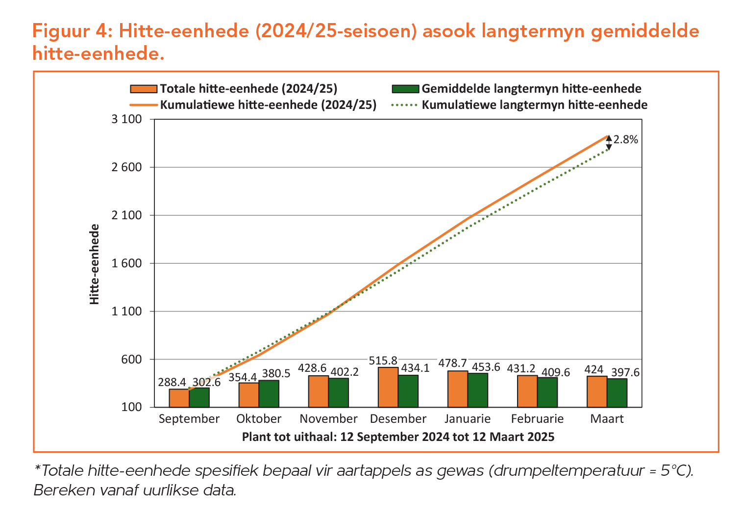 Die versameling van hitte-eenhede gedurende ’n groeitydperk is ’n belangrike faktor in die ontwikkeling van ’n aartappelplant. Die tendens van hitte-eenhede wat vir hierdie seisoen se kultivarproef op Reitz beskikbaar is, blyk naby aan, maar tog ’n aks hoër te wees, as die langtermyn datatendens van hitte-eenhede (Figuur 4).
