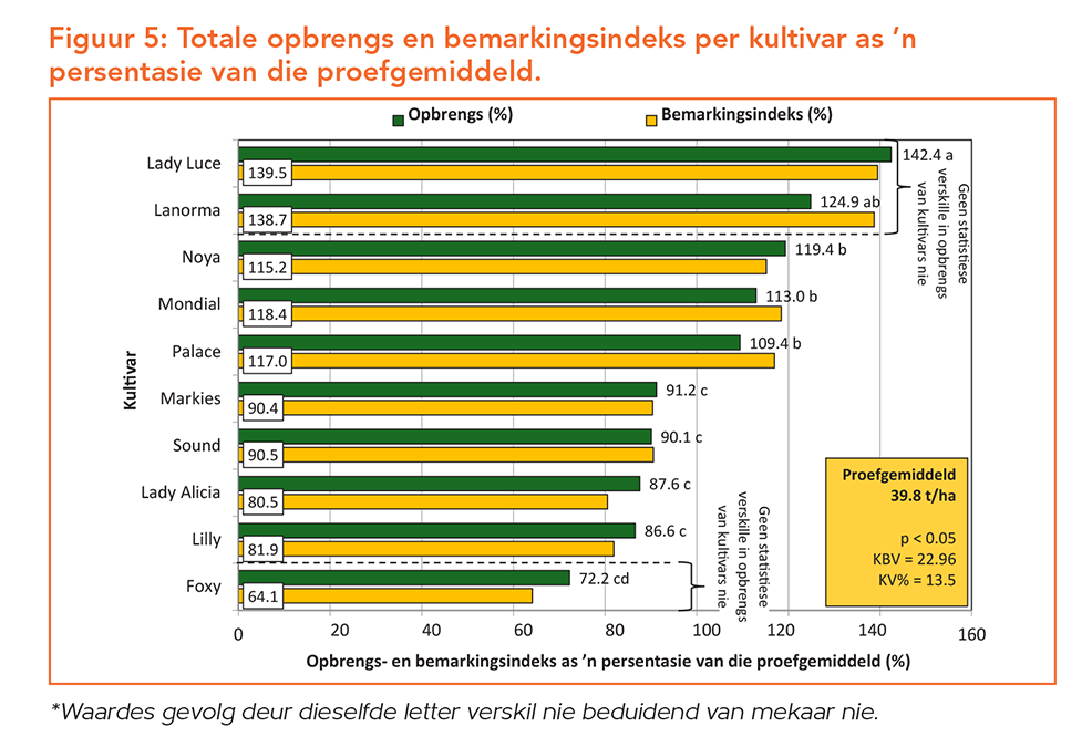 Lady Luce en Lanorma het die beste opbrengs gelewer met geen statistiese verskil in opbrengs nie. Hierdie kultivars het ook die beste bemarkingsindeks behaal. ’n Goeie bemarkingsindeks word toegeskryf aan ’n hoër opbrengs van groot aartappels en/of aartappels van goeie gehalte.