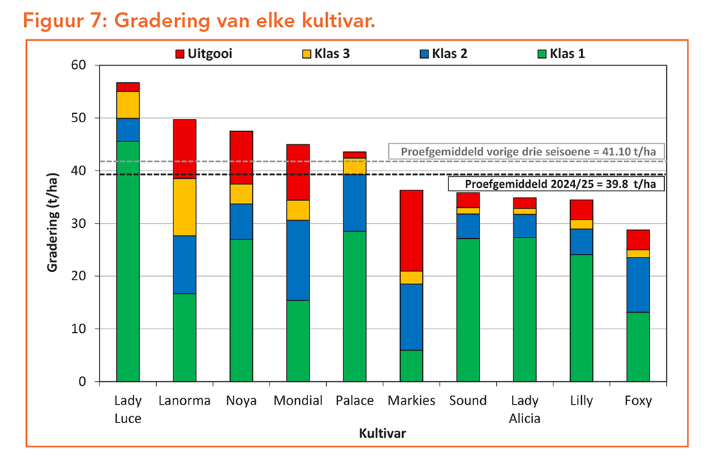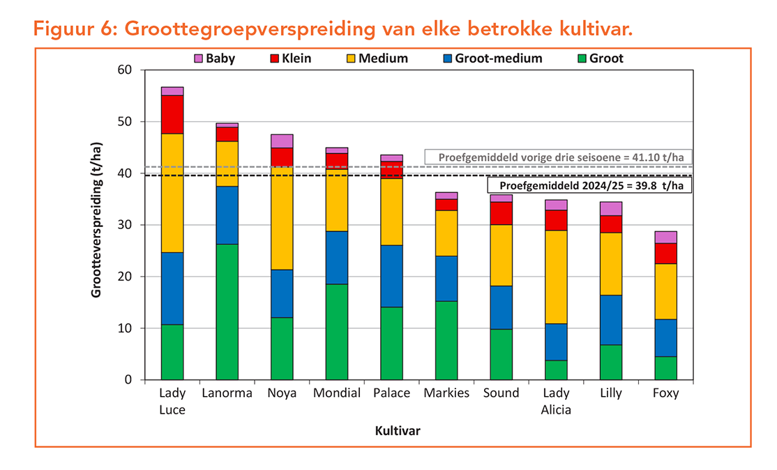 Groottegroepverspreiding en gradering is onontbeerlike evaluasies wanneer gekyk word na die bemarkbaarheid van ’n kultivar (Figuur 6 en 7).