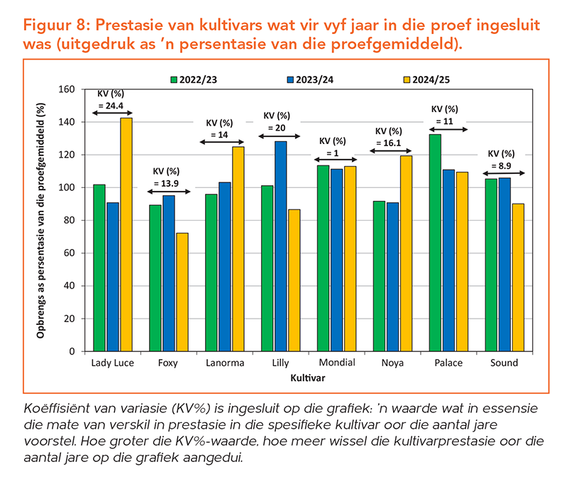 Derhalwe is dit belangrik om konsekwente kultivarprestasie oor ’n aantal seisoene in ag te neem. Die stabiliteit van kultivars in die afgelope drie seisoene word in Figuur 8 aangedui. Mondial en Sound toon die meeste konsekwentheid oor drie seisoene.
