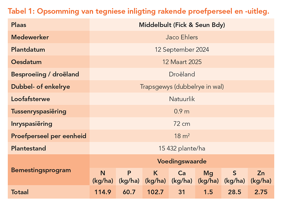 Die kultivarproef by Reitz is in ’n ewekansige blokontwerp met drie herhalings per kultivar uitgelê. Tabel 1 bevat bykomende tegniese inligting rakende die proef.