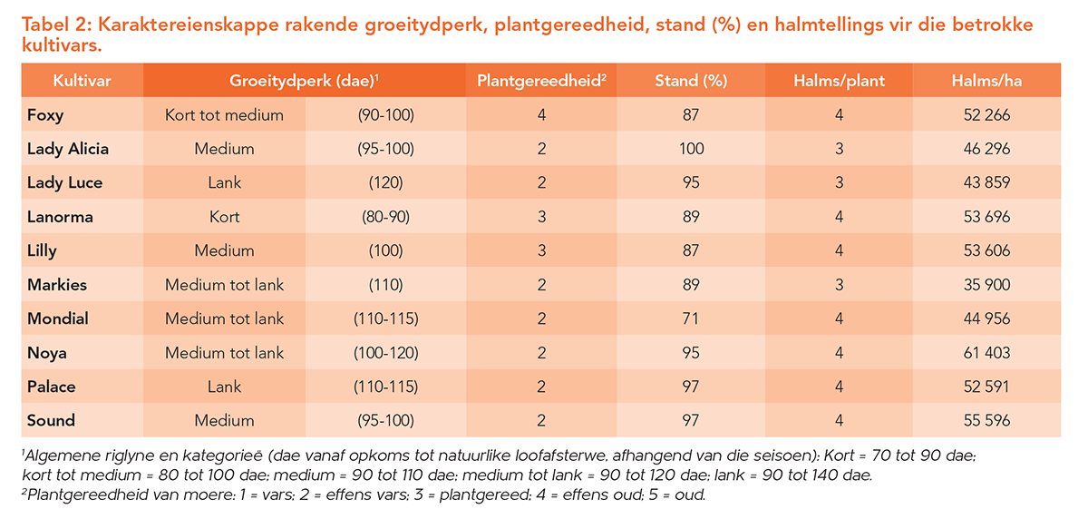 Tabel 2 sit uiteen hoe hierdie groeitydperke van kultivar tot kultivar verskil. Plantgereedheid van moere ten tyde van die plant van die proef, sowel as standpersentasie en halmtelling wat later in die groeitydperk waargeneem is, word ook in Tabel 2 aangedui.