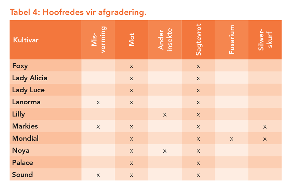 Die hoofredes vir afgradering word in Tabel 4 aangedui. Mot en sagtevrot was die grootste redes vir die afgradering van kultivargehalte in hierdie proef. Laasgenoemde kan gedeeltelik toegeskryf word aan die uitermatige nat toestande gedurende die tydperk voor uithaal.