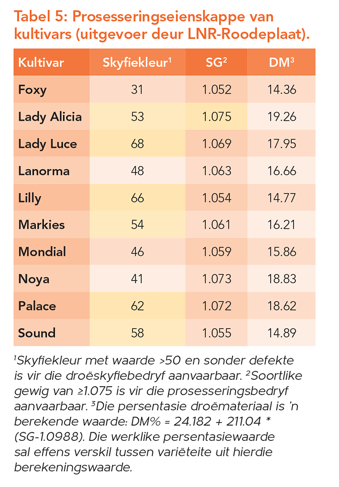 Om aan prosesseringsvereistes te voldoen, moet kultivars aan ’n skyfiekleurnorm van >50 en ’n soortlike gewig (SG) van ≥1.075 voldoen (Tabel 5). Talle kultivars het die vereiste skyfiekleur getoon, maar slegs Lady Alicia het aan beide vereistes voldoen. – Enrike Verster, Aartappels SA