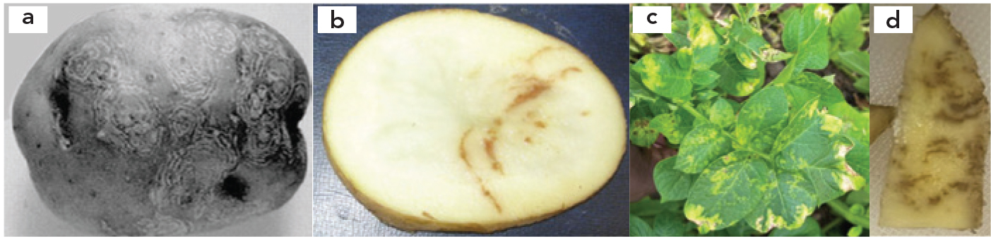 PepRSV can be observed as a yellowing of the leaves (Photo 1c), through ring spots on the tubers and through symptoms accompanied by internal browning (Photo 1d). In several cases, the disease can also occur as an asymptomatic, latent infection. Photo 1d shows a tuber with severe symptoms, but this degree of symptoms is rarely observed. Most tubers appear symptom-free or exhibit only a small number of brown spots or ring-like spots.