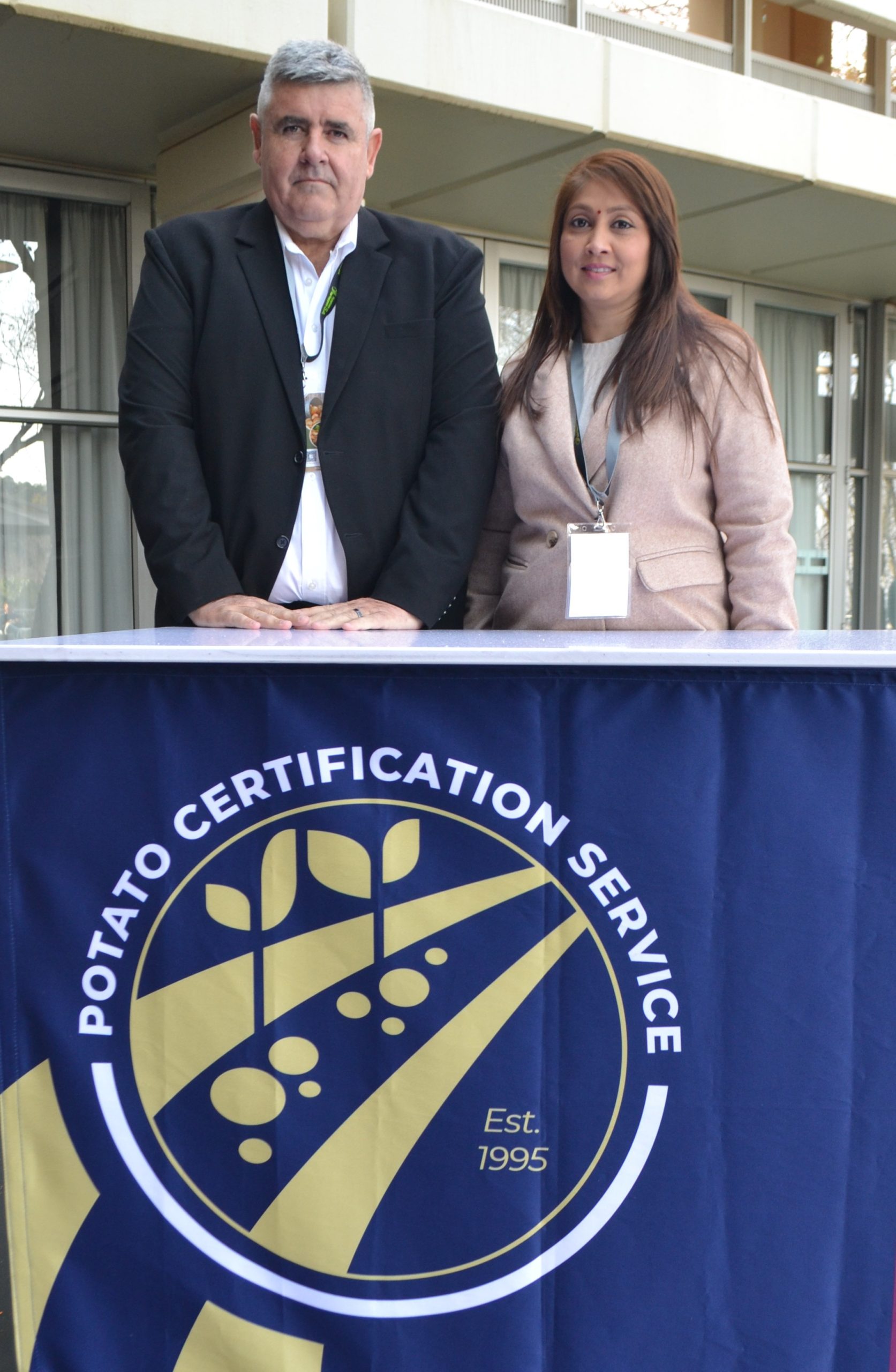 Gerhard Posthumus, chairperson of Potato Certification Services (PCS), and Ashika Jaimangal, registrar of the Plant Improvement Act, 1976 (Act 53 of 1976), with the new PCS logo in the forefront.