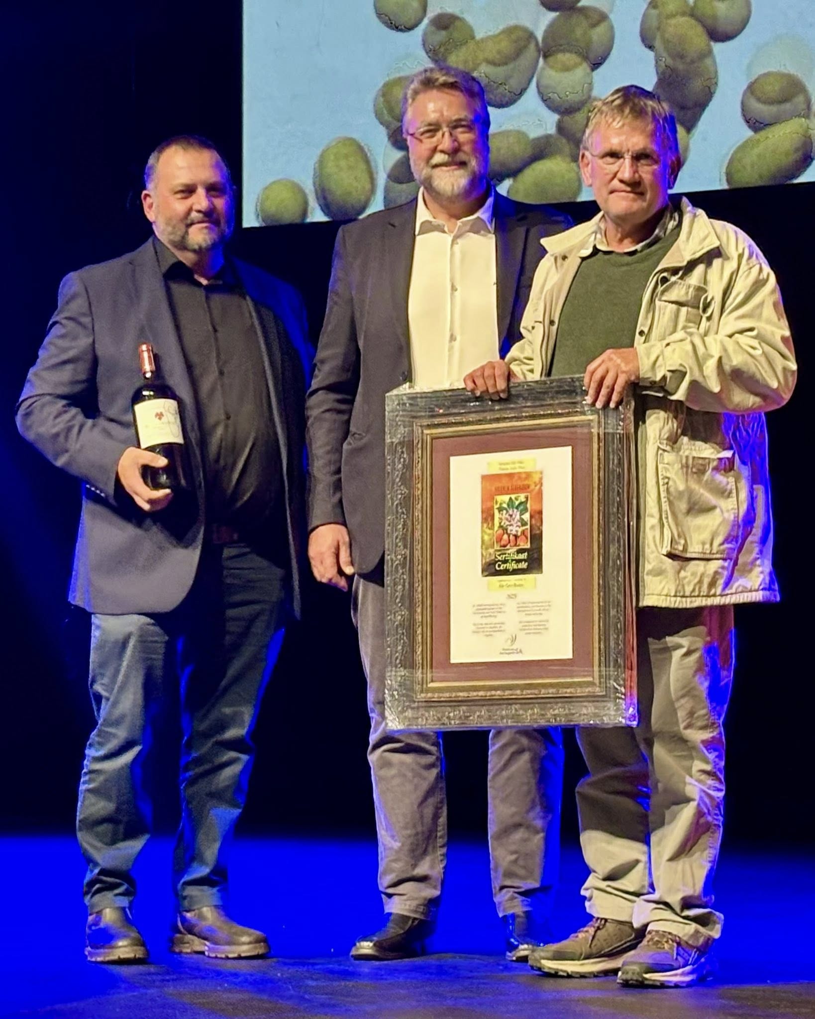 From the left are André Coetzee and Willie Jacobs of Potatoes SA with potato producer, Gert Bester, who received a Solanum Tuberosum award.
