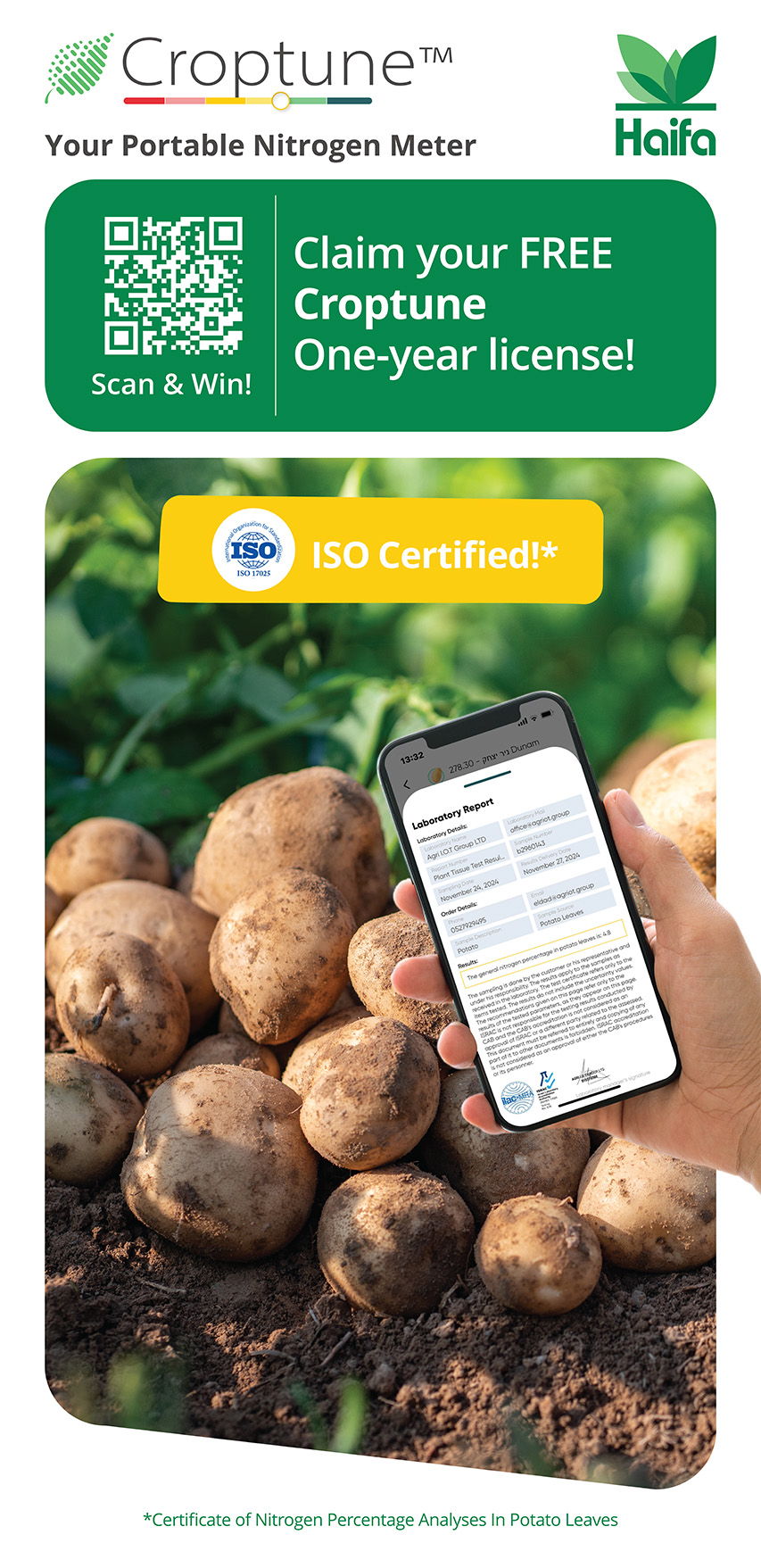 Croptune™ is ISO 17025-certified, ensuring reliable and accurate nitrogen measurements. By applying nitrogen only when needed, farmers can reduce fertiliser and application costs, and improve efficiency. The app delivers instant results, eliminating the waiting period associated with lab testing. With real-time data, farmers can ensure their potato crops receive optimal nutrition, leading to healthier plants and higher yields.