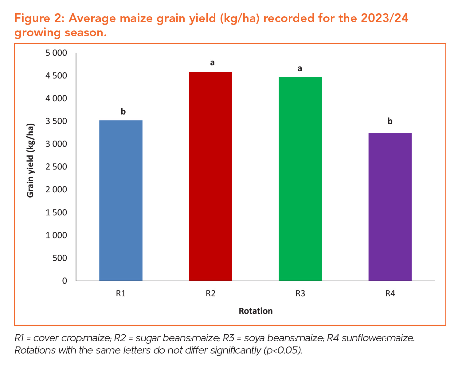 The trial produced an average grain yield of 3 950 kg/ha, which is acceptable given the dry season experienced. Maize yields (Figure 2) followed a similar trend in respect of plant height. The highest grain yields were from treatments where maize followed sugar beans (4 580 kg/ha) and soya beans (4 470 kg/ha), followed by treatments where maize followed cover crops (3 520 kg/ha). The lowest yield was recorded for the treatment where maize followed sunflower, yielding 3 240 kg/ha.