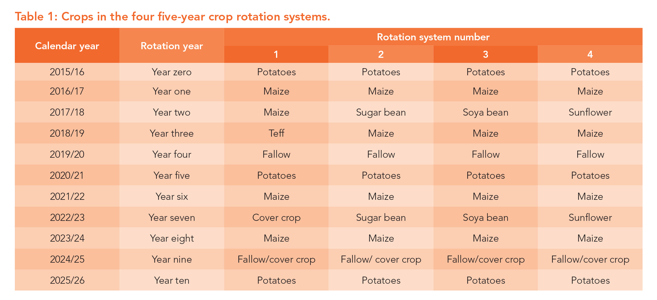 Interest in using crop rotation to enhance the profitability of dryland crop production and mitigate financial risk was recently rekindled. Virtually no research into crop rotation systems that include potatoes has previously been conducted in South Africa. Consequently, the long-term goal of this study is to evaluate and optimise crop rotation systems for potato production in the Eastern Free State to improve soil health, the physical and chemical conditions of soil, and the profitability of dryland potato production in the region.