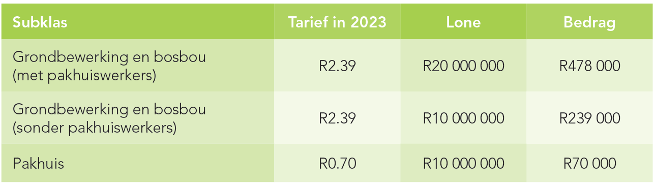 ‘n Aartappelprodusente het vanaf 1 Maart 2023 tot 28 Februarie 2024 (die 2023-belastingjaar) lone ten bedrae van R20 miljoen aan al sy werkers betaal. Dit sluit R10 000 vir pakhuiswerkers in. Tabel 1 gee ‘n uiteensetting van hoe die koste van die onderskeie subklasse in hierdie geval sou verskil.