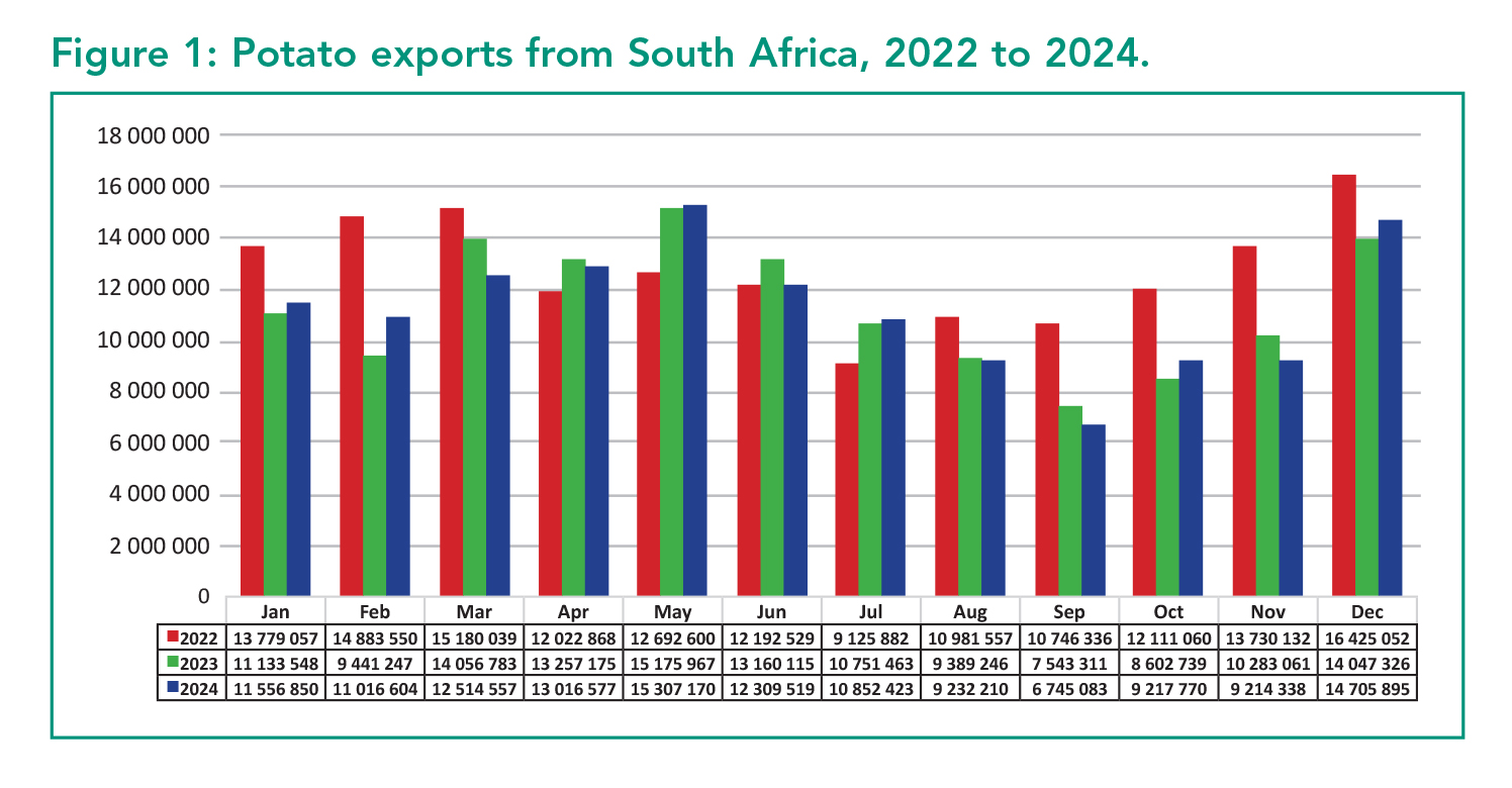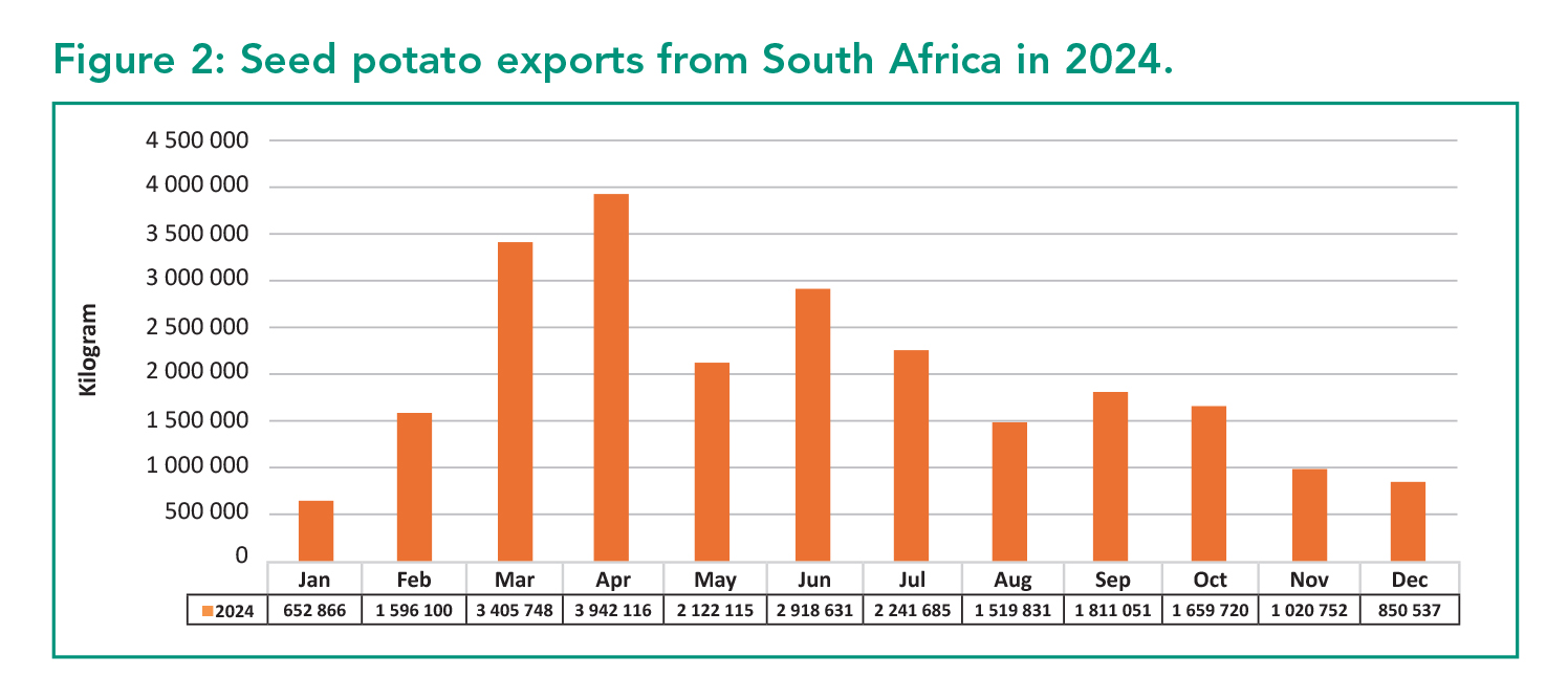 South Africa is also a net exporter of seed potatoes, exporting most of its certified seed to the African market, which includes Mozambique, Zimbabwe, Lesotho, Botswana, Namibia, and Eswatini. South Africa exported 23 741 152 kg of potato seed in 2024.