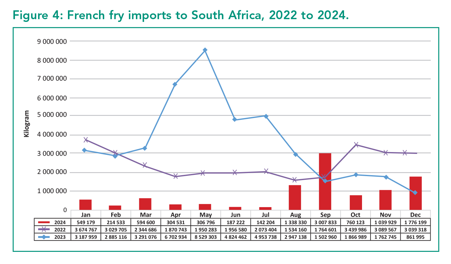 While South Africa is largely self-sufficient in terms of potato production, there are imports coming into the country, such as frozen French fries. Since the South African Revenue Services (SARS) imposed anti-dumping duties on Belgium, the Netherlands and Germany, South Africa has seen a significant decrease in these imports. Last year, a total of 10 221 479 kg of French fries were imported to South Africa. This represents a 76% decrease from 2023, and a 65% decrease from 2022 when there was a lapse in the previous anti-dumping duties imposed on Belgium, the Netherlands, and Germany (Figure 4). Belgium remains the biggest exporter of frozen chips or French fries to South Africa despite anti-dumping duties of 67,33% imposed on the country.