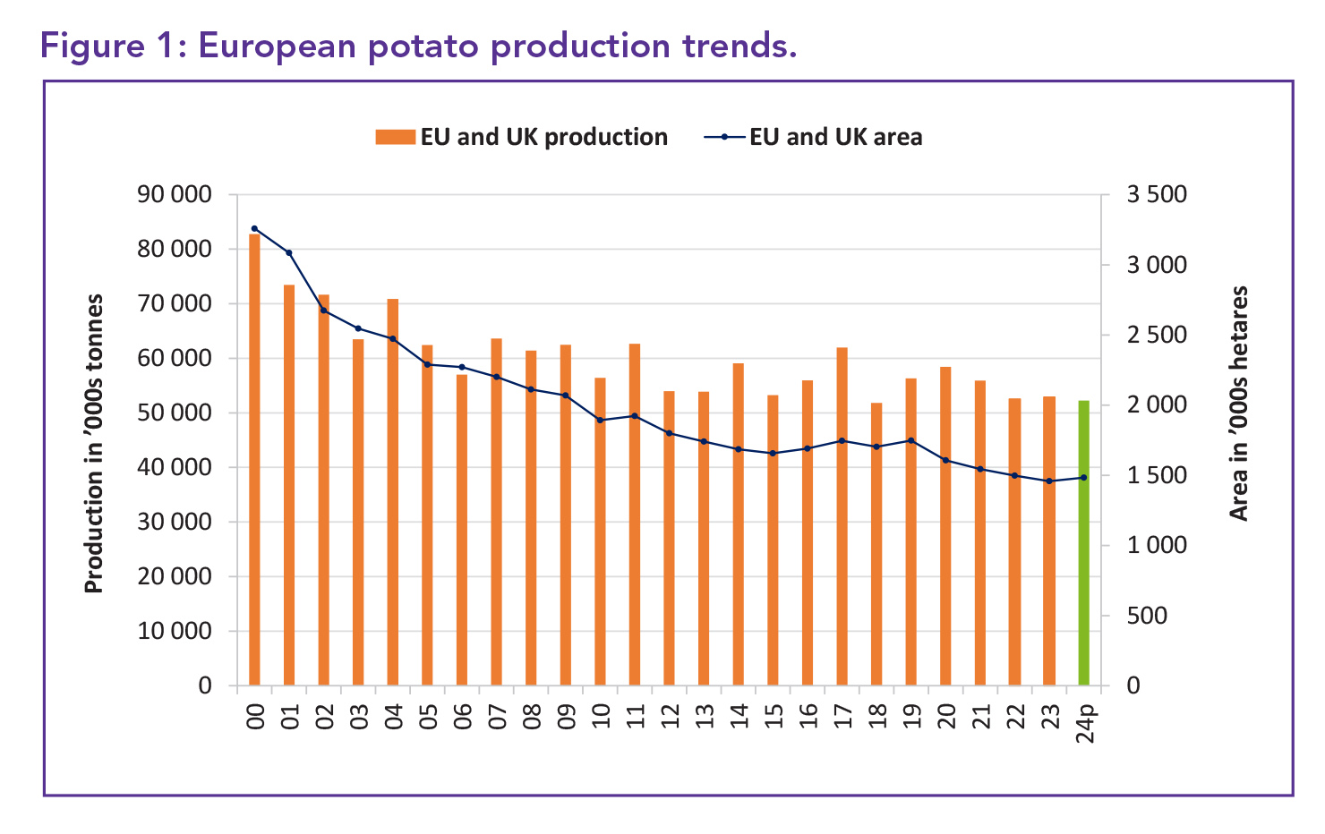 European potato production has decreased by 40% since 2000 (Figure 1). This decline is partly due to changes in EU support for starch potato production. There has been a steady decline in potato consumption in traditional markets. The high costs and risks associated with potato farming have persuaded growers to switch to crops such as cereals and oilseeds. Climate change has also posed challenges, with warmer and wetter winters making potato cultivation difficult.