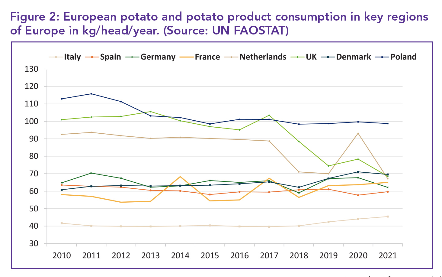Potato consumption is declining in traditional high-consuming potato countries such as the United Kingdom (UK) and Poland. Interestingly, there has been an increase in potato consumption in countries traditionally favouring pasta, such as Italy, which is showing a rise in per capita potato consumption. In France, consumption has increased by 12.1% mainly in the out-of-home segment. Danish consumption has also increased significantly, with per capita consumption reaching 70 kg in 2021 (Figure 2).
