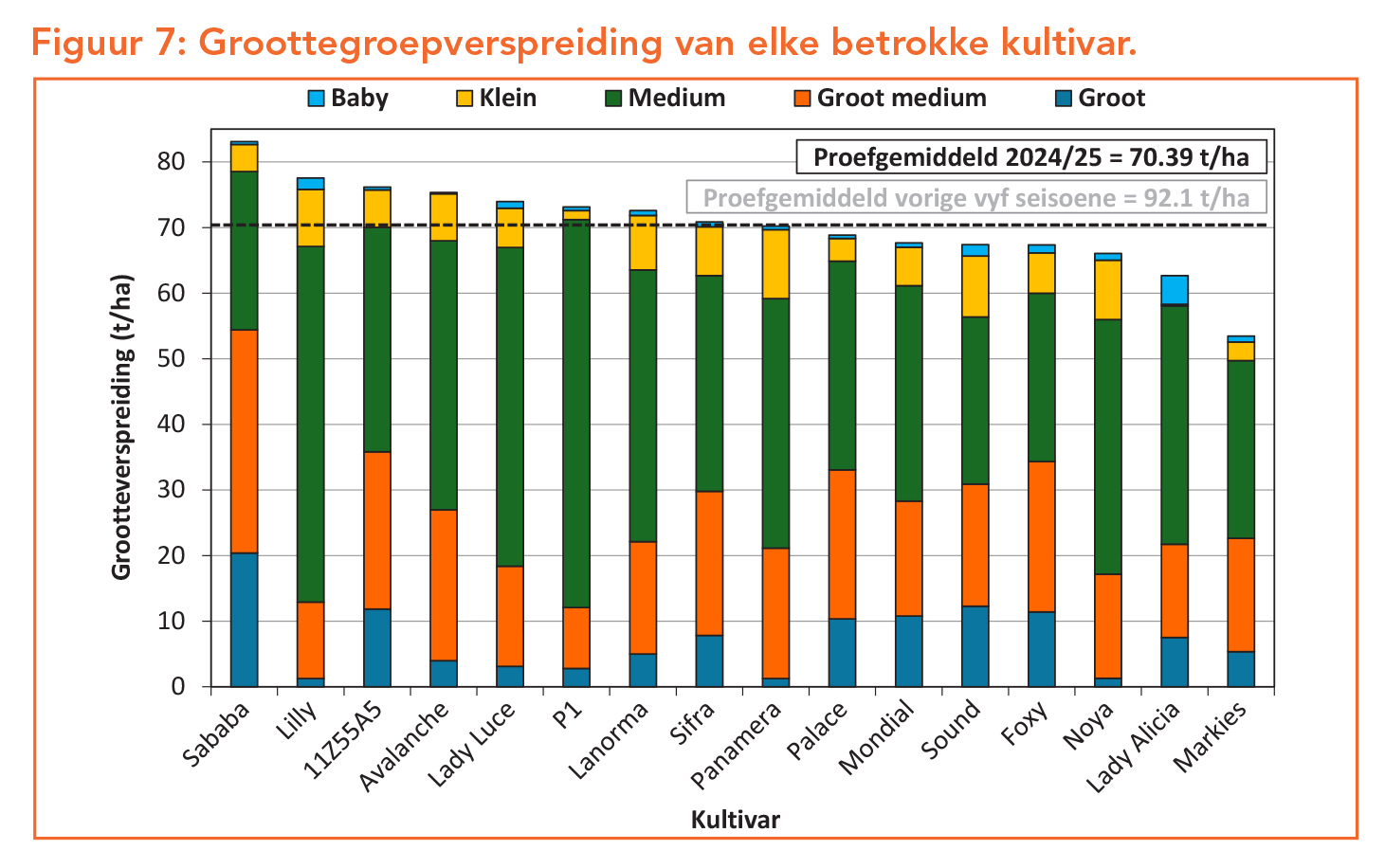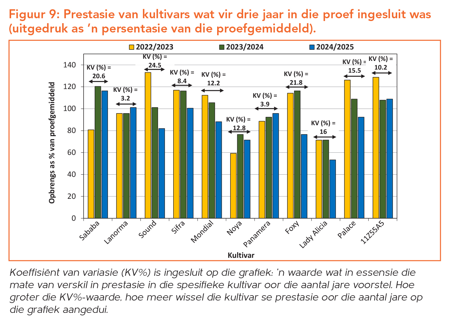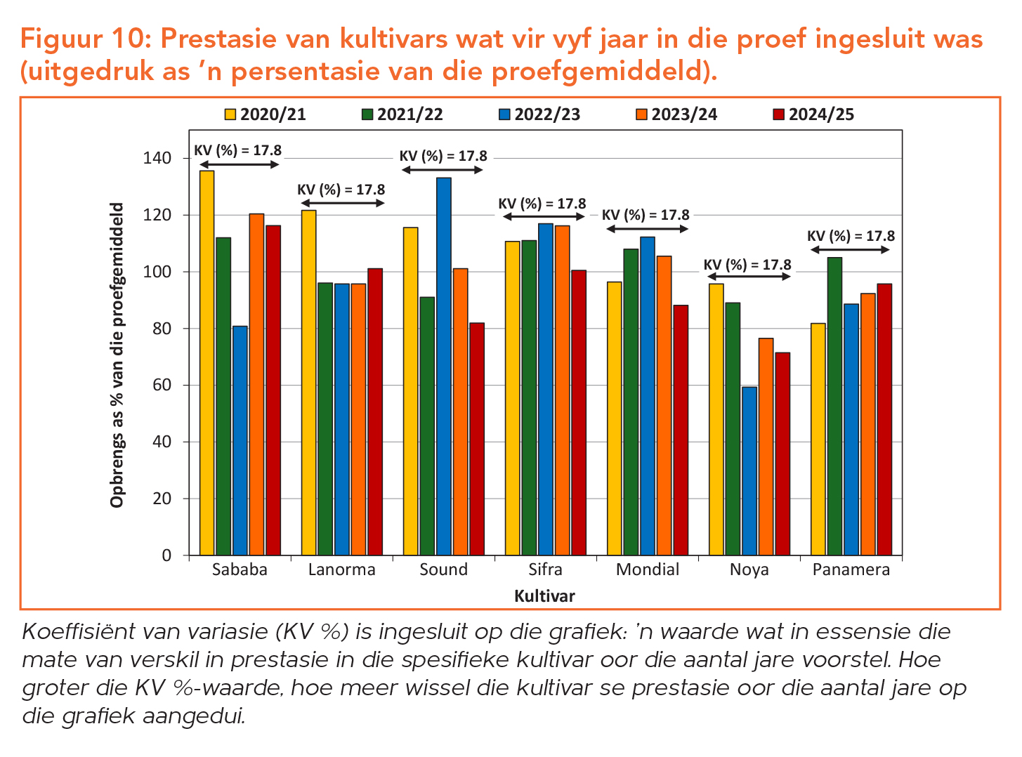 Soos die aard van seisoene is, wissel die prestasie van kultivars van seisoen tot seisoen, bloot omdat klimaat van een seisoen na ’n volgende nooit eenders is nie. Derhalwe is dit belangrik om konsekwente kultivarprestasie oor ’n aantal seisoene in ag te neem. Die afgelope drie en vyf seisoene se kultivarvariasie word in Figuur 9 en 10 onderskeidelik aangedui. Sifra, Mondial en Panamera toon in hierdie proef die meeste stabiliteit oor ’n tydperk van vyf jaar, met Lanorma wat uiters konsekwent presteer het oor die afgelope drie seisoene.