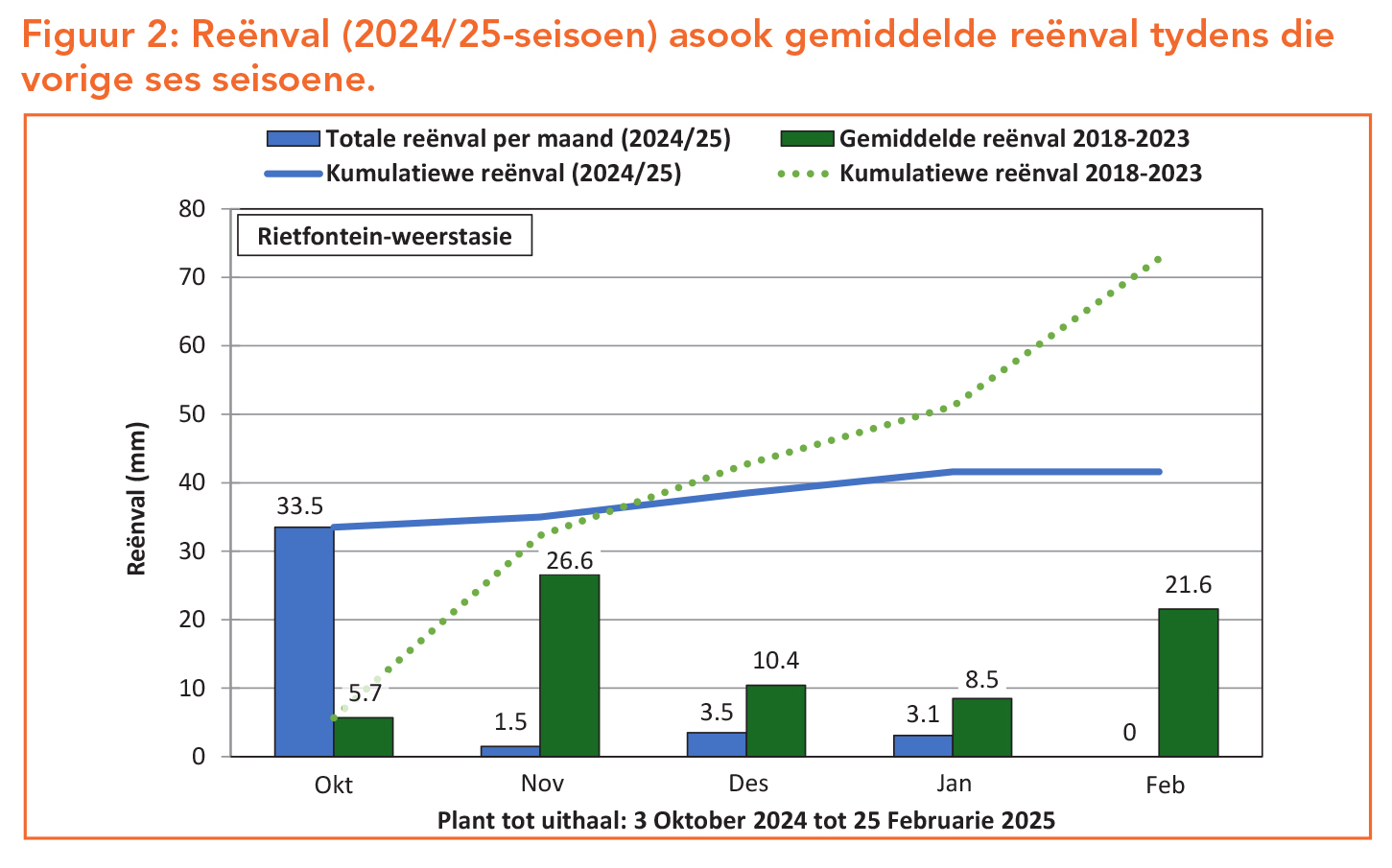 Die 2024/25-seisoen (Figuur 2) het oor die algemeen ondergemiddelde reënval ontvang – hoewel Aurora in die winterreënvalgebied val – met die uitsondering van Oktober waarin aansienlik meer reënval aangeteken is.
