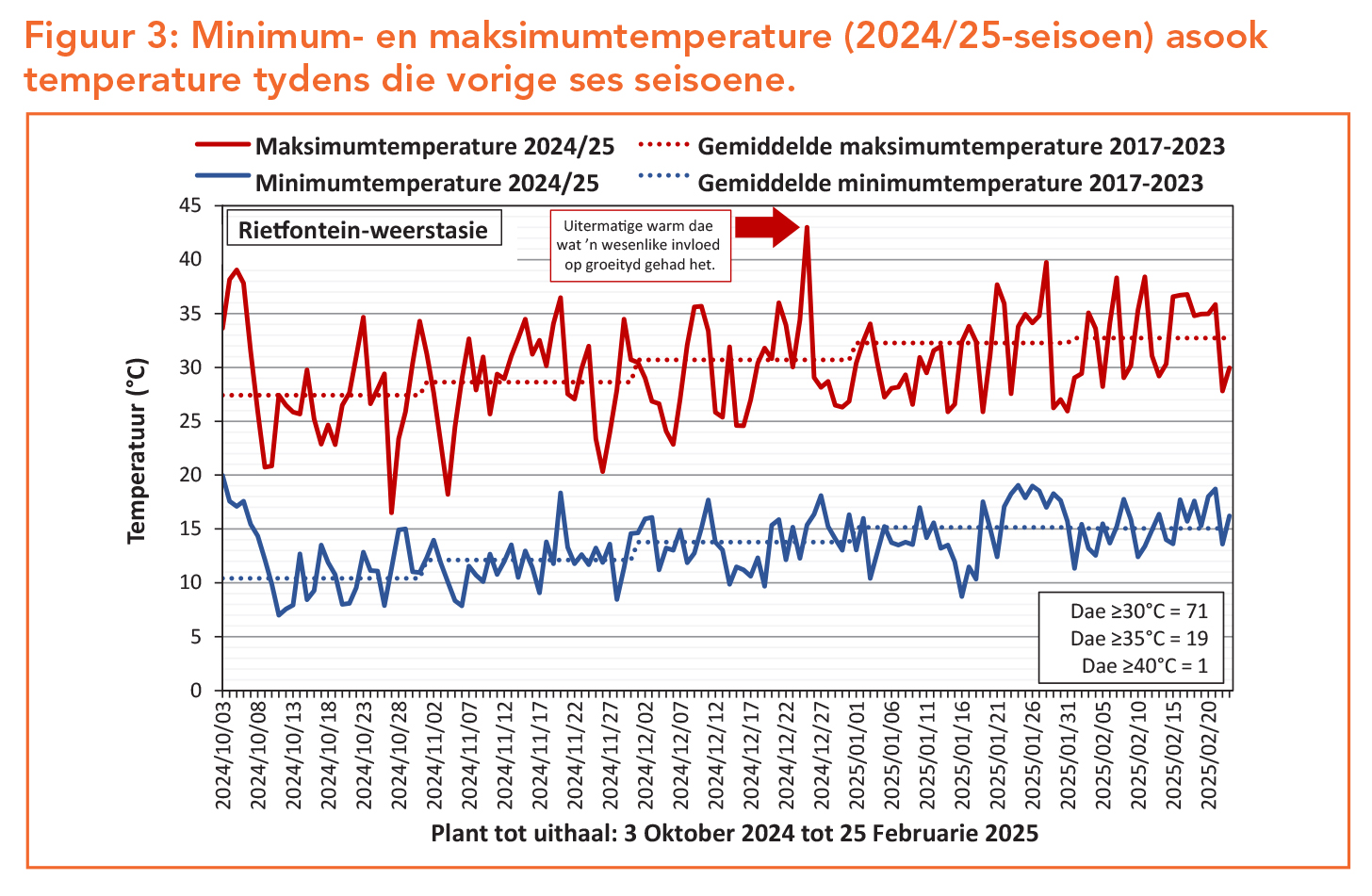 Altesaam 71 dae van temperature bo 30°C, 19 dae bo 35°C en een dag bo 40°C is gedurende die groeitydperk aangeteken – effens minder as in die vorige seisoen. Daar was egter teen die einde van Desember ’n paar dae met uitskieter-maksimumtemperature van meer as 40°C, wat ’n dramatiese invloed op die gewas se groeitydperk gehad het. Hierdie hitte het die groeifase verkort en uiteindelik ’n beduidende negatiewe uitwerking op die opbrengs gehad.