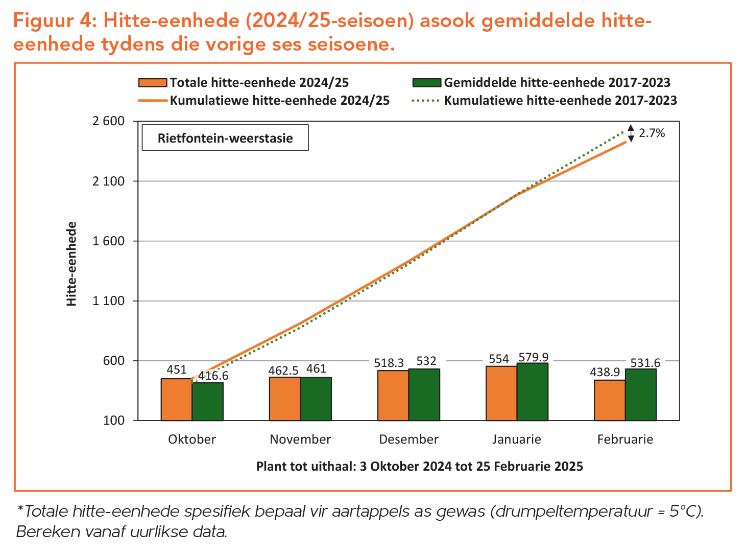 Die versameling van hitte-eenhede gedurende ’n groeitydperk is ’n belangrike faktor in die ontwikkeling van ’n aartappelplant. Die tendens van hitte-eenhede wat vir hierdie seisoen se Aurora-kultivarproef beskikbaar is, toon dat die 2024/25-seisoen se hitte-eenhede baie naby, maar tog laer is as dié van die afgelope paar seisoene (Figuur 4).