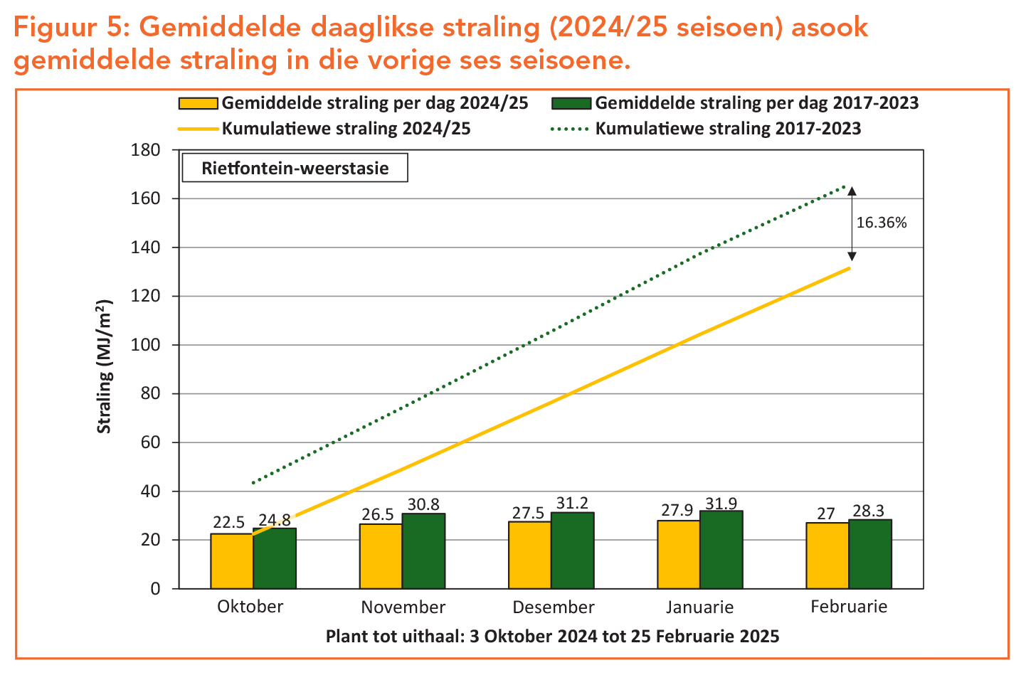 Nog ’n belangrike faktor om in ag te neem, is die hoeveelheid daaglikse straling (Figuur 5). Dit is ’n meting van die hoeveelheid sonligenergie wat ’n horisontale oppervlakte tref. ’n Toename in straling gedurende die groeitydperk lei dus tot hoër fotosintese. Die gemiddelde daaglikse straling vir die afgelope seisoen was laer as die vorige twee seisoene en verklaar die swakker opbrengste gedeeltelik. As langertermyn-data in ag geneem word, was die akkumulasie van straling – wat daagliks gemeet is – 16.36% laer in hierdie seisoen as tussen 2017 en 2024. Straling en gevolglik fotosintese en uiteindelike opbrengs vir die hele seisoen was minder as in vorige seisoene.